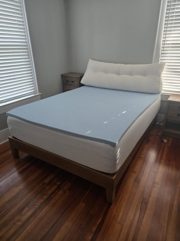 1 queen bed frame - color acorn 1 queen purple brand mattress 1 2 inche gel mattress topper 2 end tables 1 lamp All 350.00