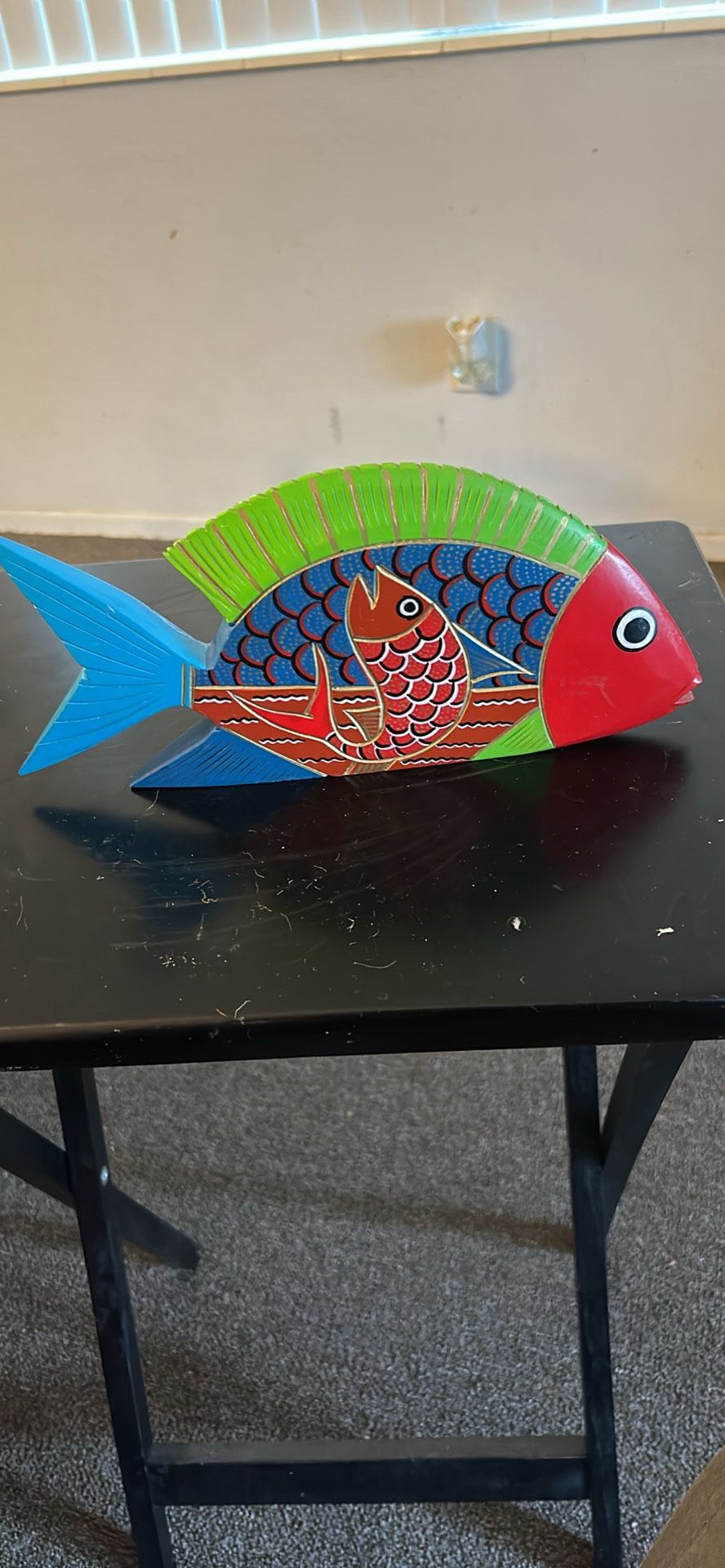 Oaxacan Hand Carved Painted Fish w/Deer Design Mexican Wood 12 Inches Wide