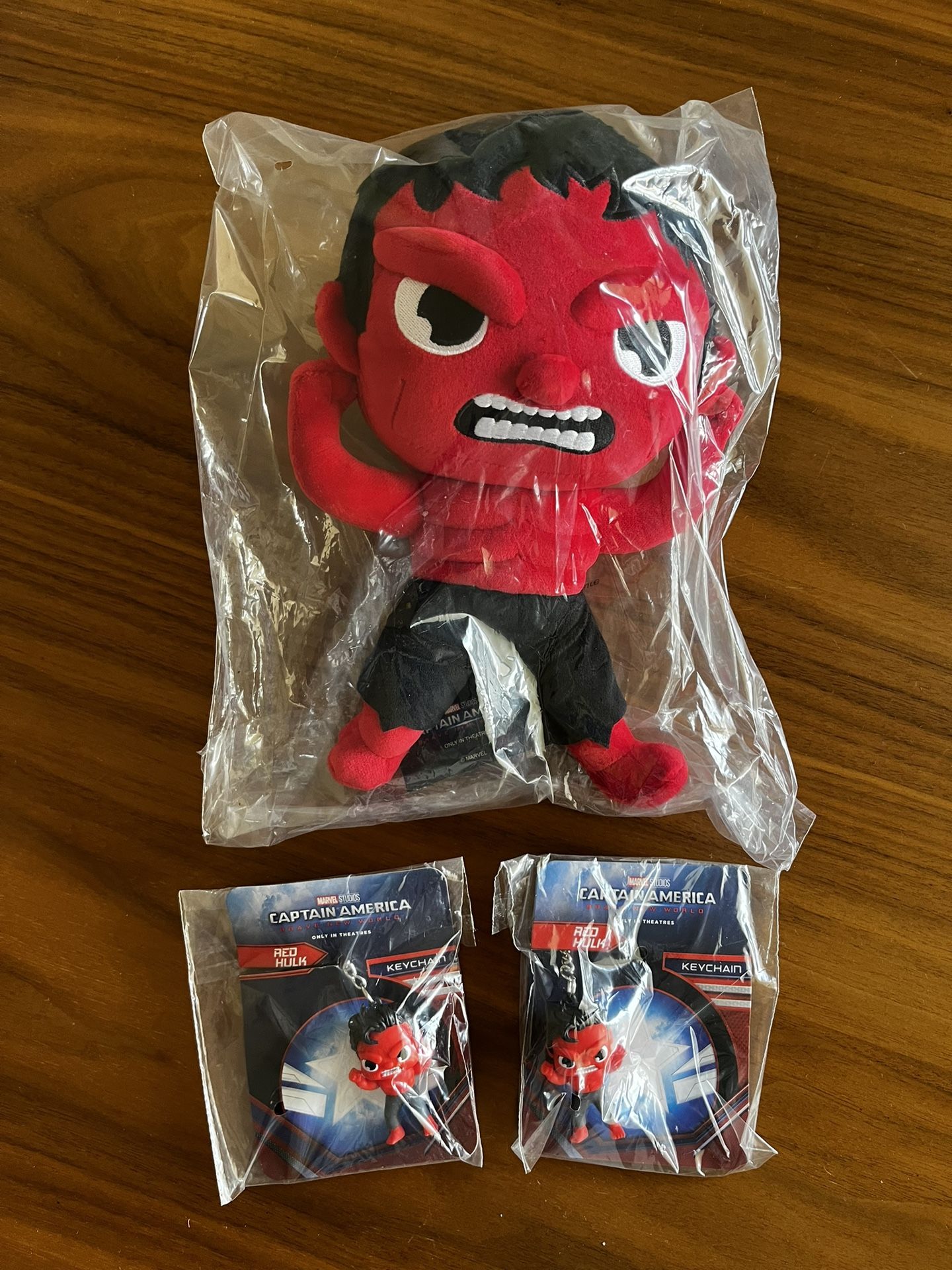 Limited edition collectibles from Big Screen event, Red Hulk plush + 2 keychains, available only in theaters on premiere day. New condition, never opened. Sold as is. Plush is 1/1 on eBay listings.