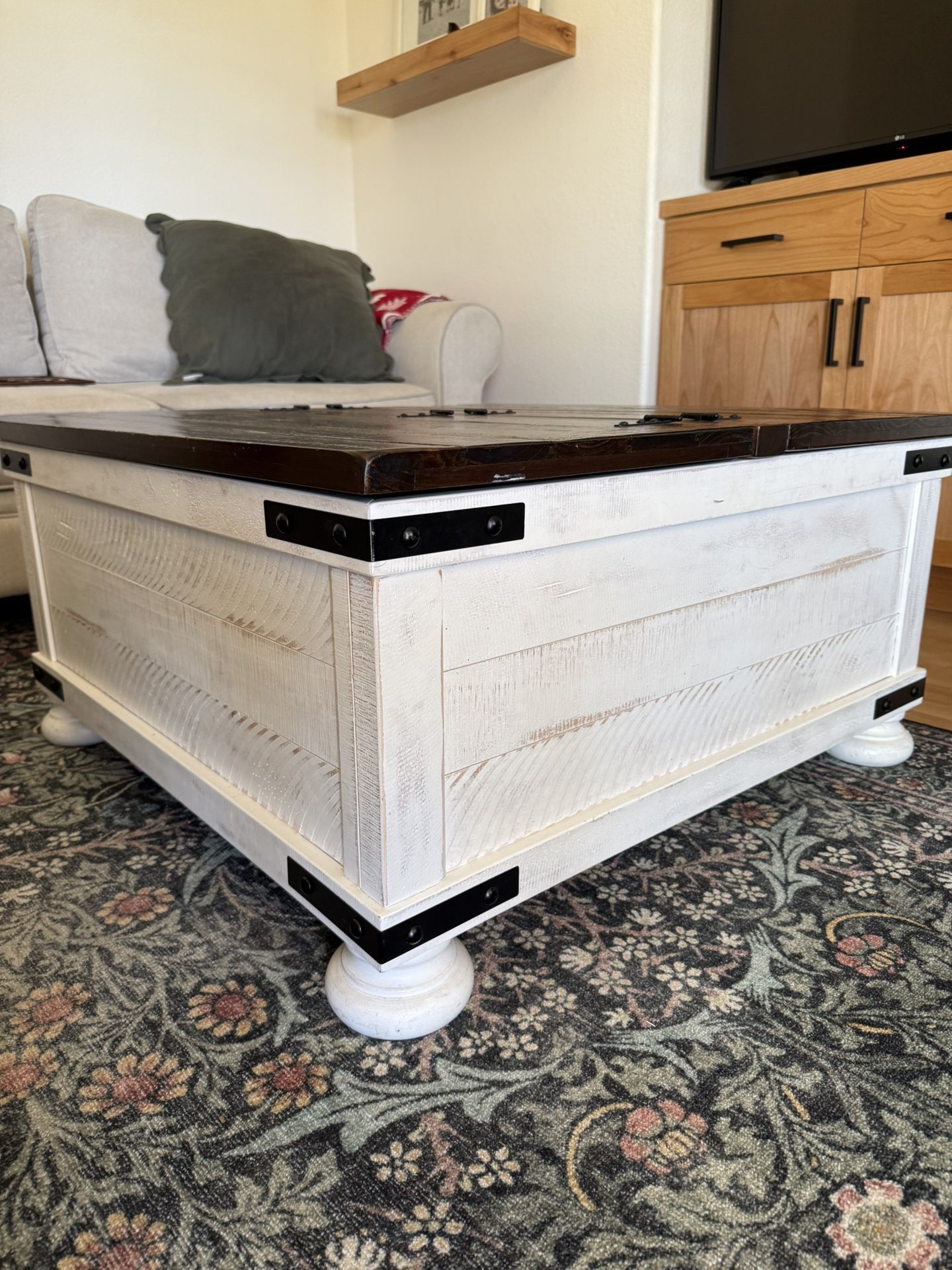 Beautiful solid farmhouse-style coffee table. Very sturdy and heavy. Great for families. Normal wear, no major damage. Some chipping on white paint on on foot. Selling because we’re downsizing- great storage!