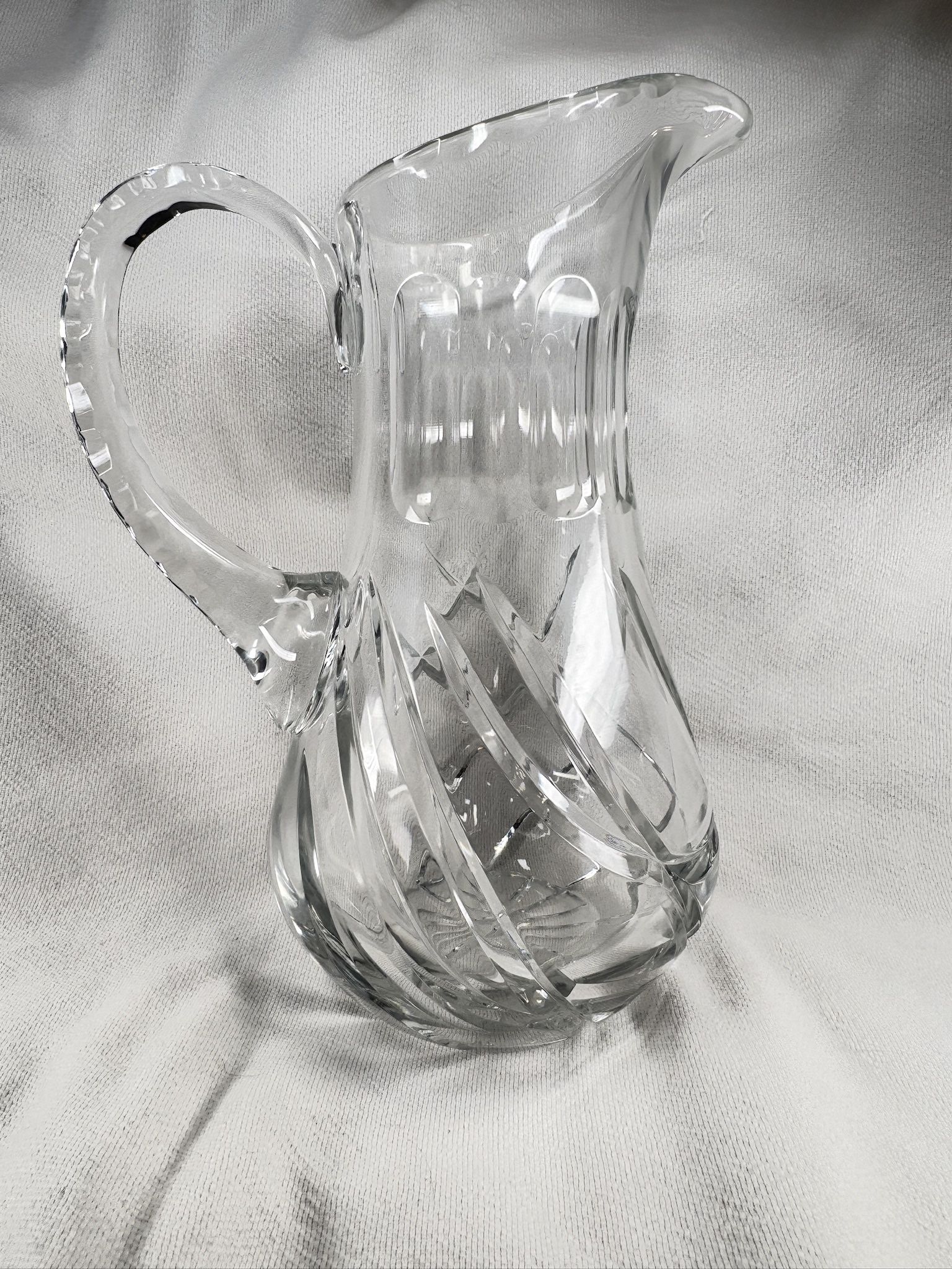 Vintage cut glass pitcher that stands 10” tall x 6.25” wide x 5” deep. It weighs 3.4 lbs.