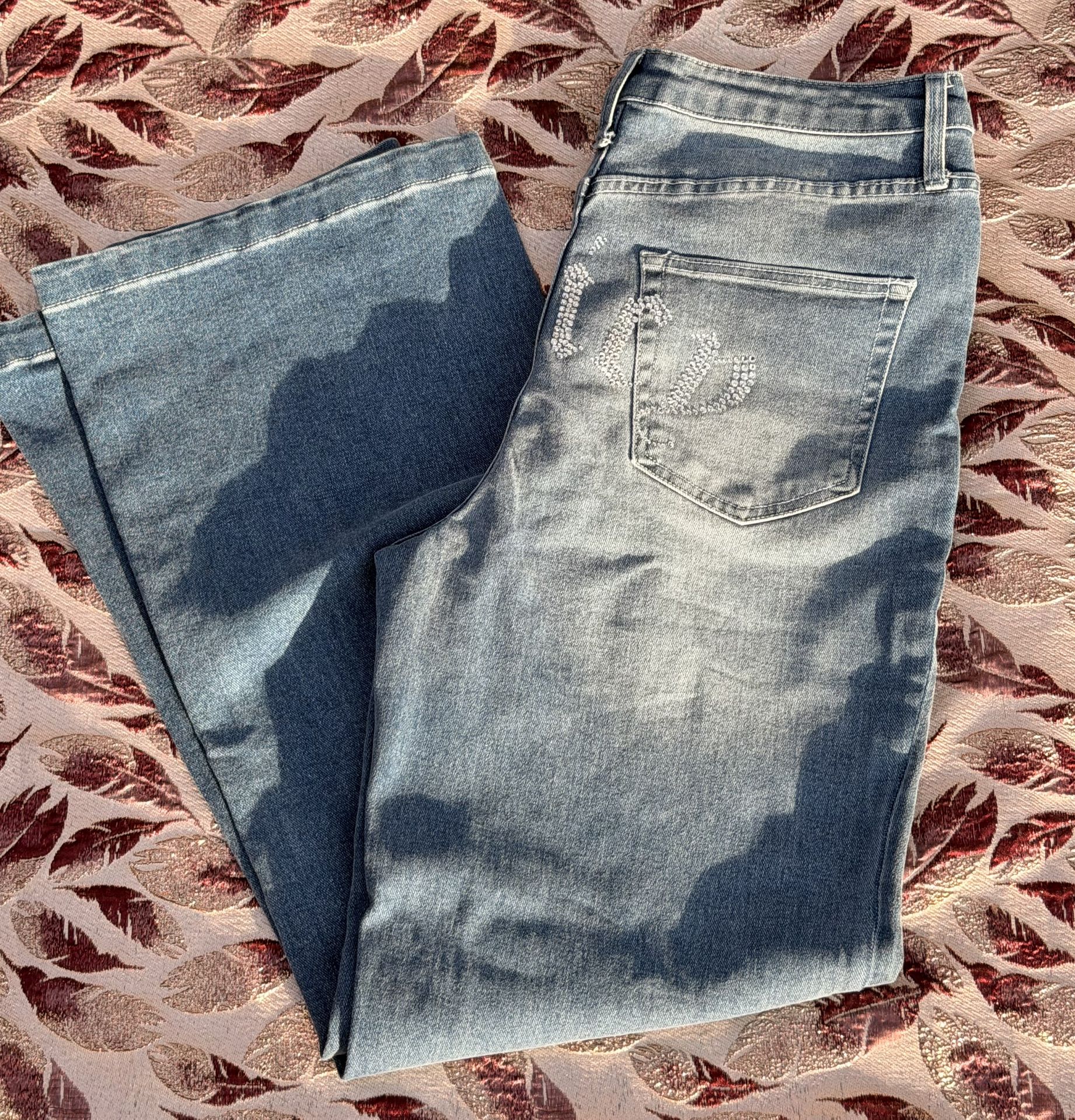 -Size 13 -Lunita wide-leg jeans in a light blue denim wash with a rhinestone logo across the back pockets -Bought for $85 -Brand New, Never Worn