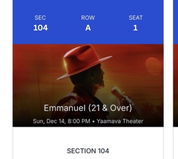 Six seats available Section 104, Row A Seats 1-6 Yaamava Theater $75 each. One parking pass included.
