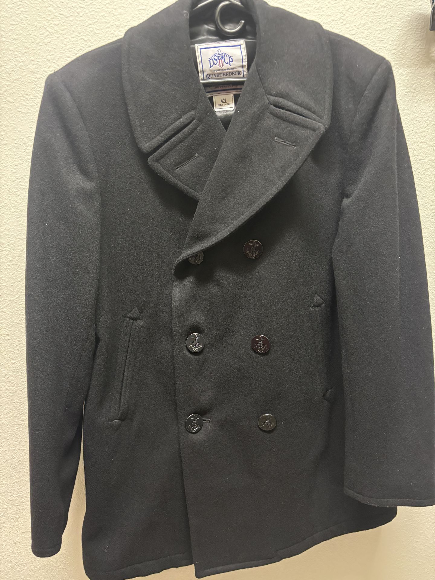 Authentic US Navy pea coat like new condition-size 42L Barely worn - no signs of wear or flaws. Heavy Melton wool stays warm even when wet Double breasted, anchor buttons Quality you can’t find anymore, built to last Side pockets Size 42L fits chest 42-44 Retails for $200 $60 obo Smoke free pet free home