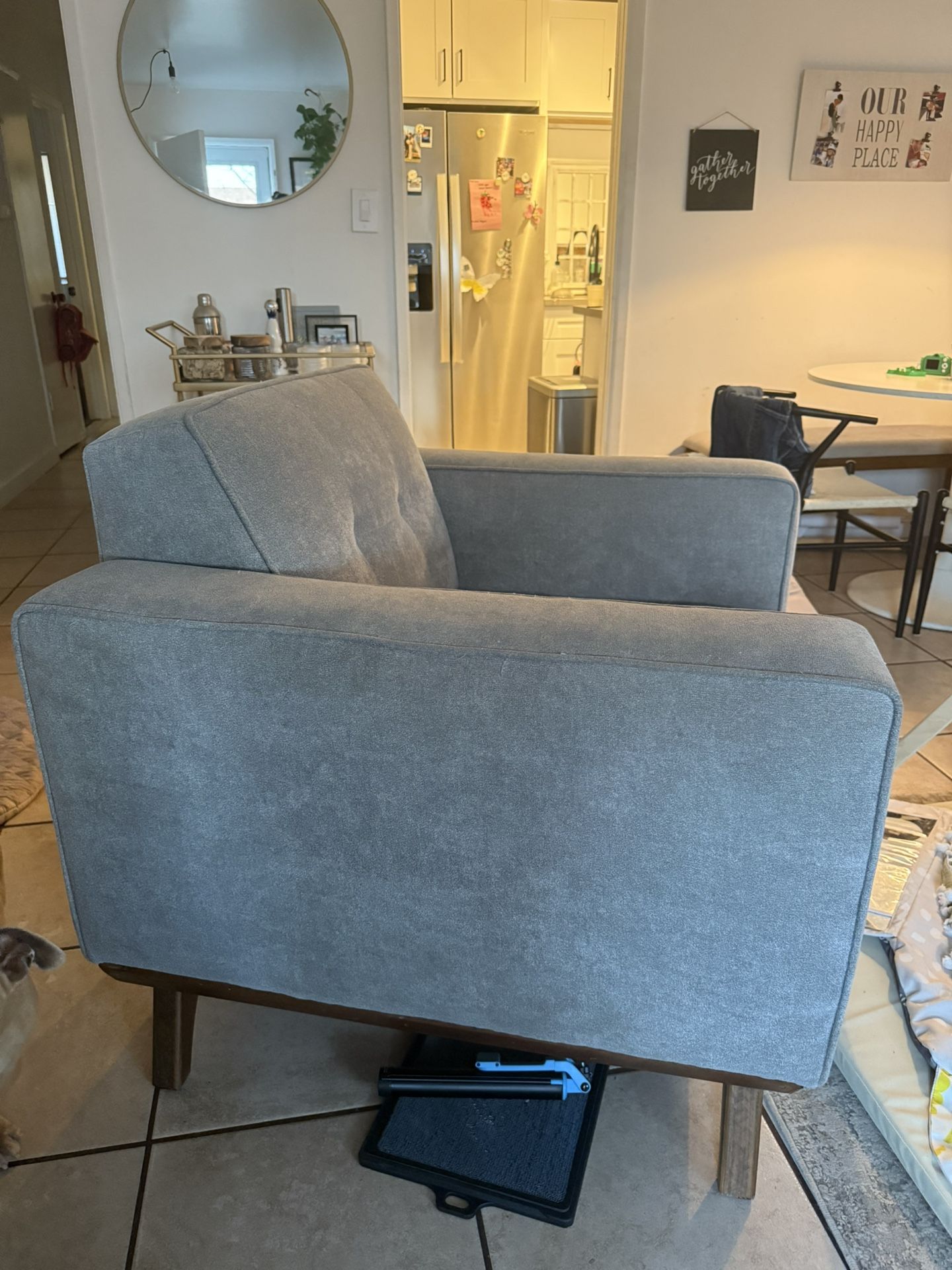 Grey Big and heavy Includes loveseat and lounge chair Set of 3, MUST take all *slight rip on loveseat* Needs to be steamed and it’ll look brand new.