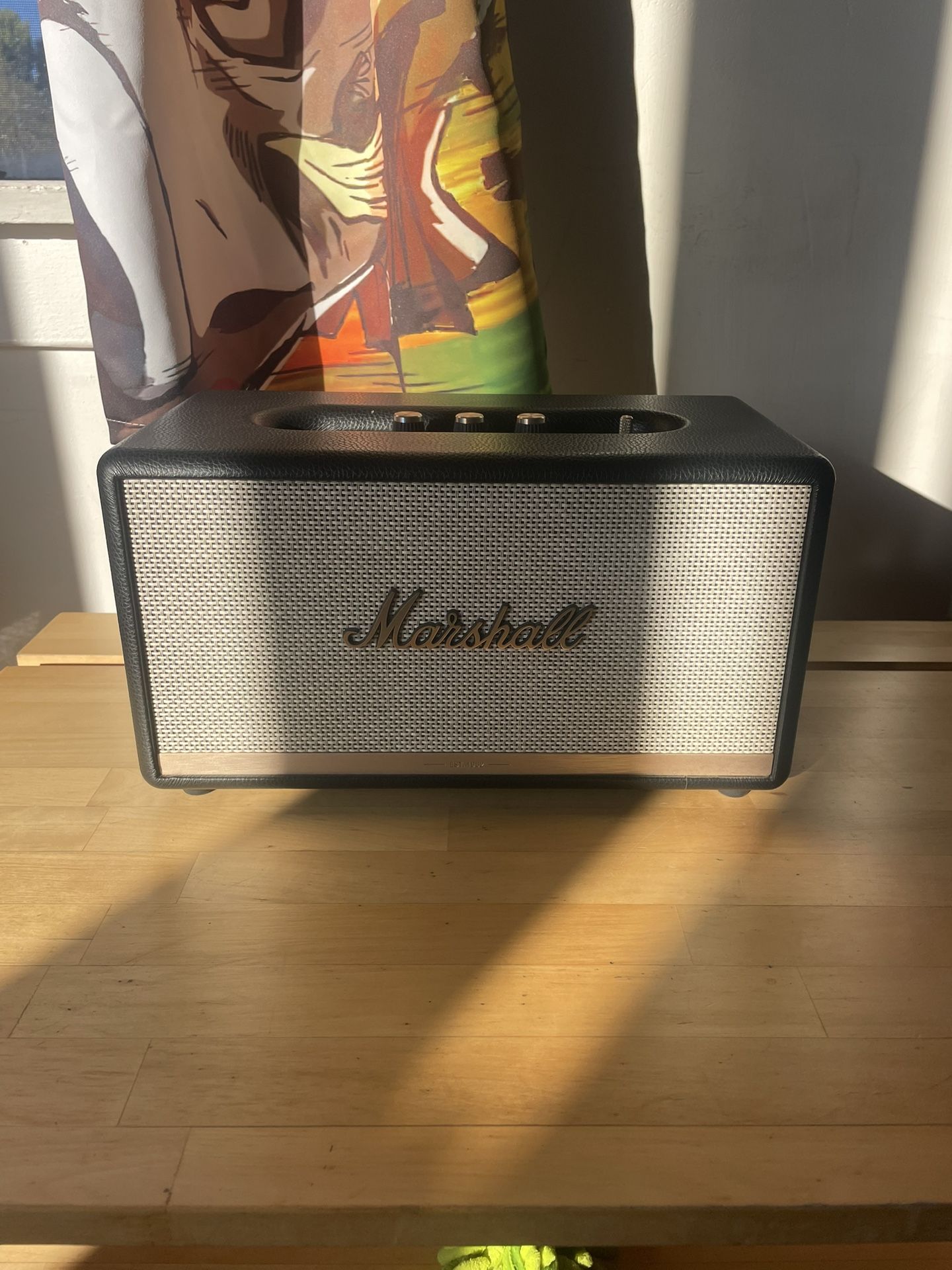 Like new Key Features and Performance • Iconic Design: Wrapped in textured vinyl with a salt-and-pepper fret and the script logo, it is built to look like a mini guitar amp. It features analog brass knobs on the top panel for tactile control. • Customizable Audio: You can fine-tune your music using the top-panel knobs for bass and treble or the Marshall Bluetooth app, which offers a five-band digital EQ. • Multiple Connectivity Options: Beyond Bluetooth 5.0 with aptX for high-quality wireless streaming, it includes a 3.5mm auxiliary input and an RCA input on the back for connecting turntables or other wired devices. • Room-Filling Sound: Equipped with one 50-watt woofer and two 15-watt tweeters, it delivers a bold sound that easily fills medium-to-large rooms.