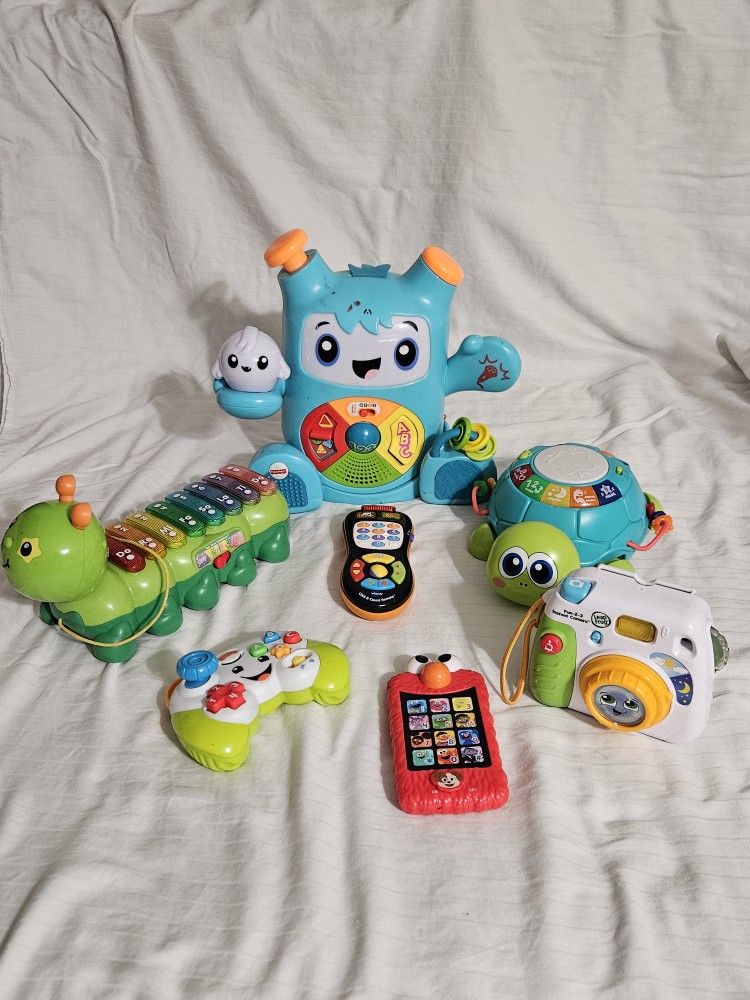 Please read everything before asking questions. Fisher Price Groove Rockit dance learning toy Fisher Price Laugh and Learn Game Control V-tech Zoo Jamz Xylophone V-tech Baby Remote Control Leap Frog Fun-2-3 Instant Camera Sesame Street Learn with Elmo Phone Caunedy Musical Turtle All toys have been checked and work. I took all batteries out because I use rechargeable batteries. If you want to verify upon pick-up bring your own batteries and screw driver. Toys are sold as a bundle only. Thank u! Located in Nuevo near Menifee Rd. And San Jacinto Rd.