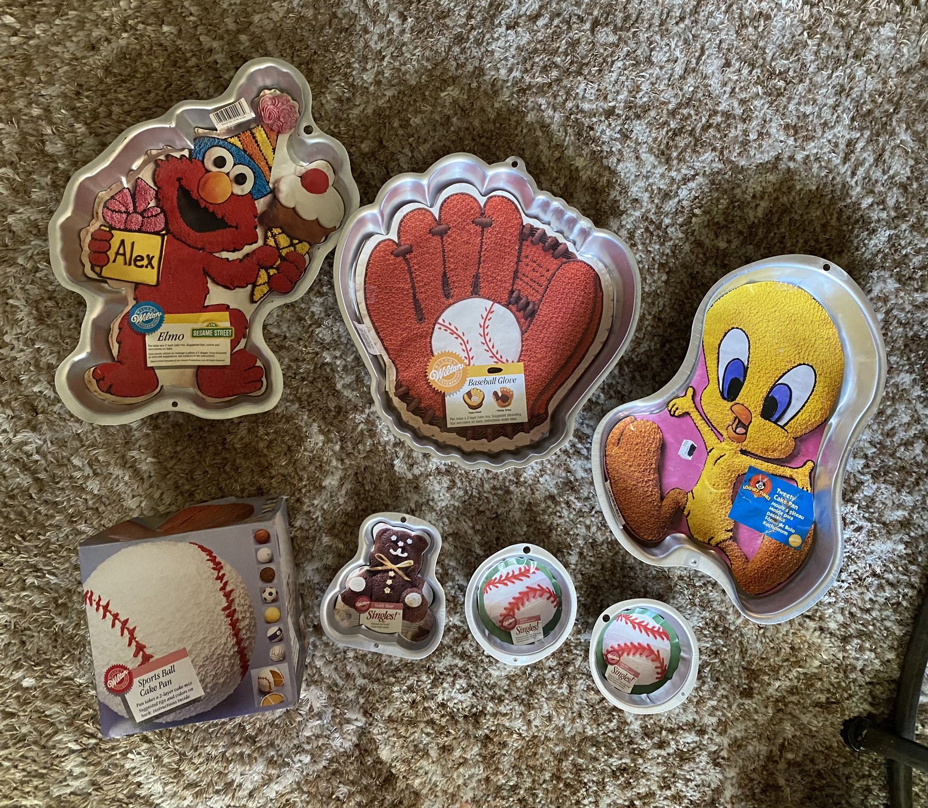 💵$20 for all💵 1st Row ~Birthday Elmo-1996 ~Baseball Glove-1987 ~Tweety Bird-1998 2nd Row ~Sports Ball (baseball, soccer, tennis, bowling ball, cue ball, volleyball, basketball and golf ball instructions included) w/ 2 half ball molds and baking stand rings ~Teddy Bear single ~2 Baseball single All in great condition Cash only, X posted, Meet at QT on Vivion Rd and N Brighton Ave in the northland