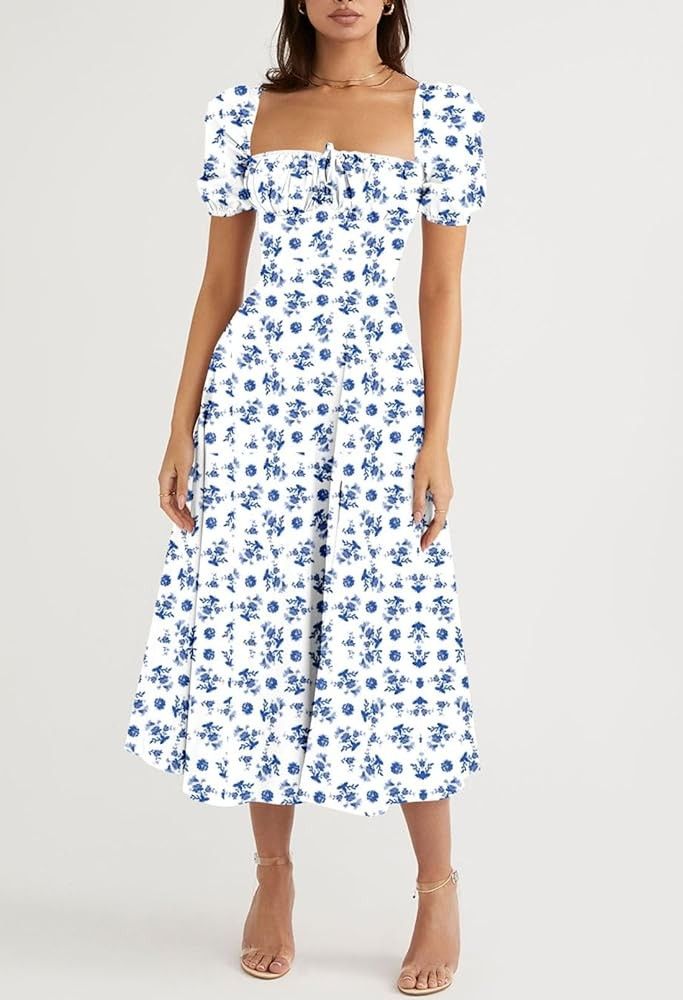 Puff Sleeve Floral Maxi Dress Elegant Square Neck Cottagecore Boho Split