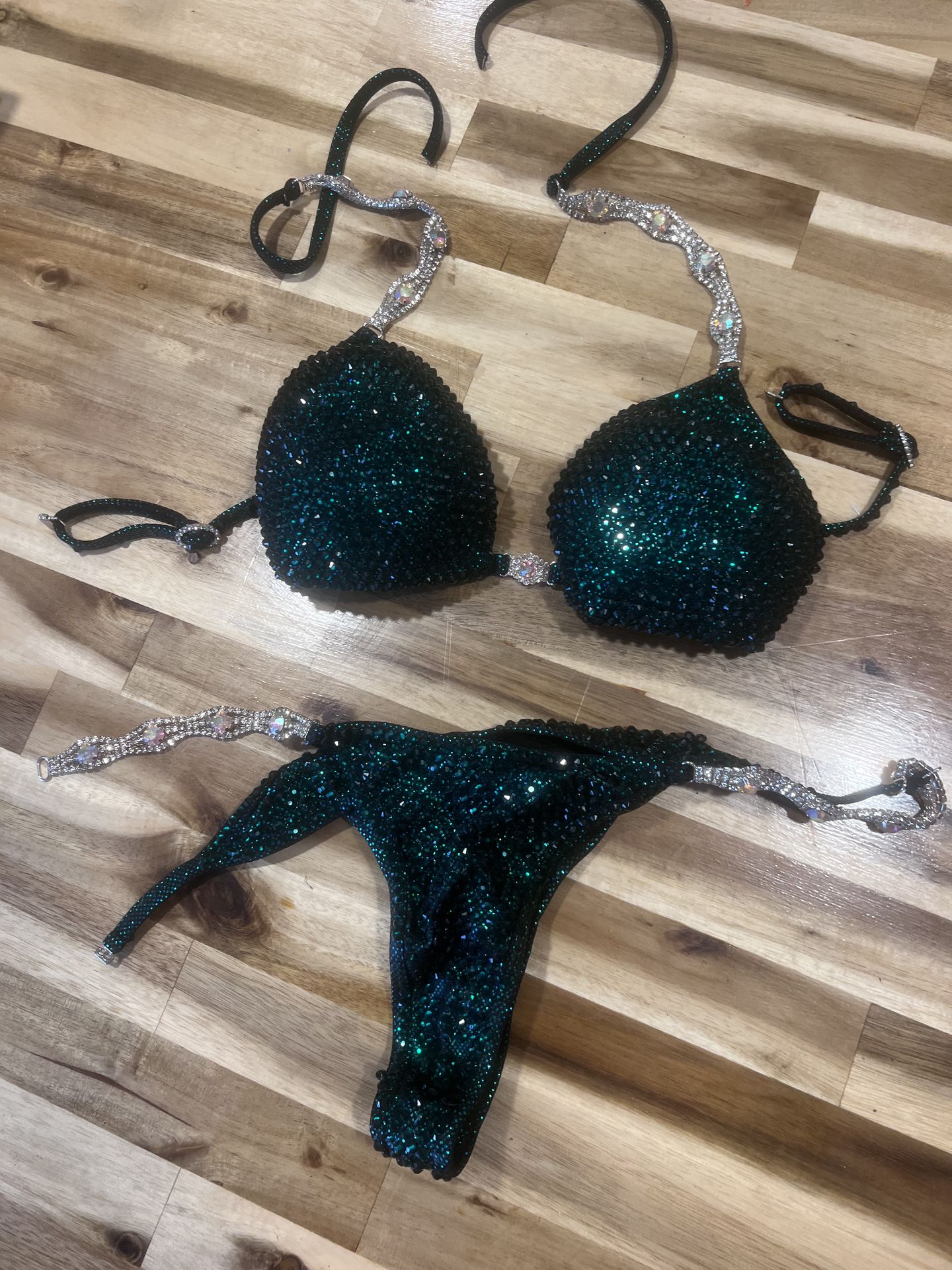 Worn for a body building comp in 2021 - has been cleaned and stored away. Shoes are size 10 will sell separately for $45. Suit dimensions are (I’m no seamstress so message me if you need something different from this lol) TOP: Cup edge to cup edge 13 inches. Tie back Adjustable halter top straps. Fully padded. A cup. BOTTOM: Crotch to top - 7 in. Adjustable hip straps