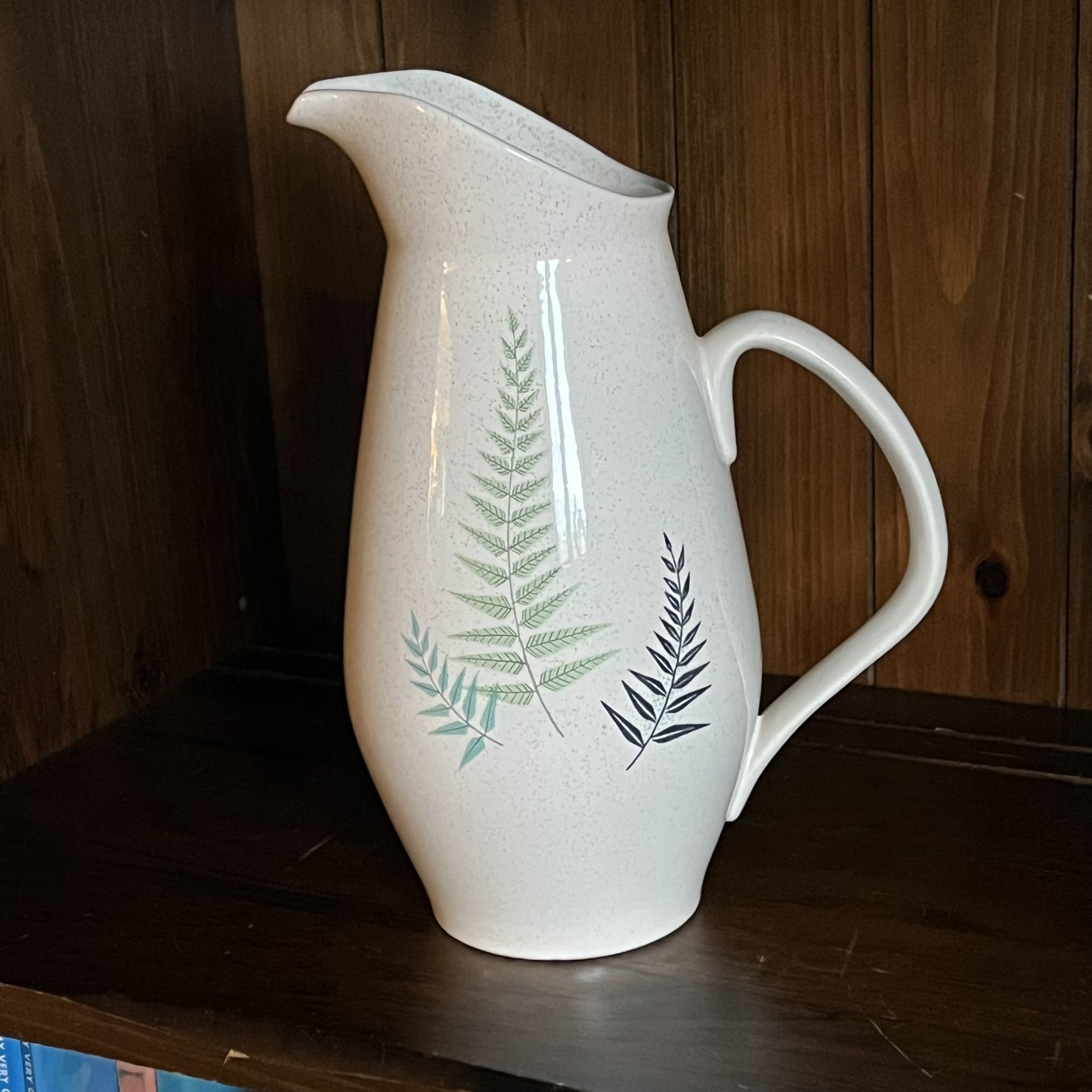 Beautiful Franciscan Fern Leaves Pitcher! Vintage mid century item! Two different leaf designs on front and back. 10-1/4” H to top of spout, 5” at widest width, 7-1/2” including handle. In excellent condition, but please see photos for small chip on the bottom edge. Makes a great vase! Pick up Franklin Square or it ships!