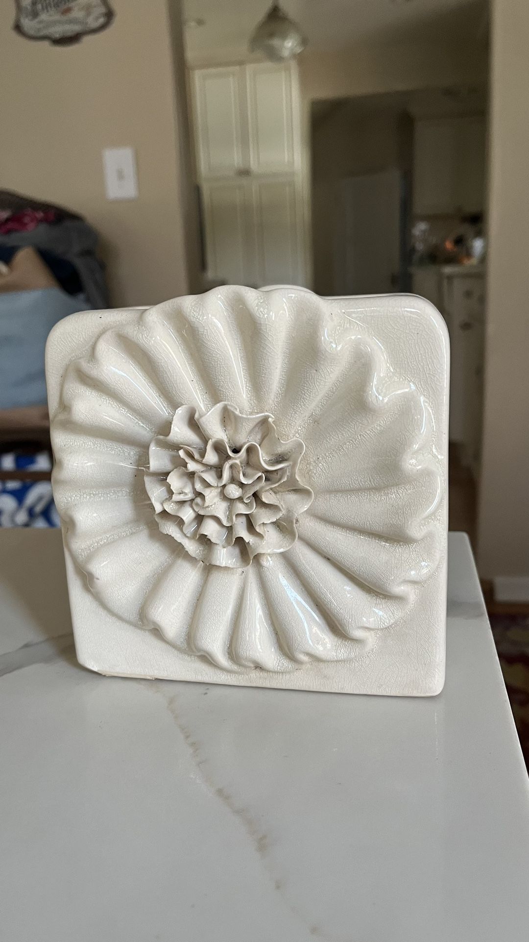 Vintage square vase with flower with aged crackle