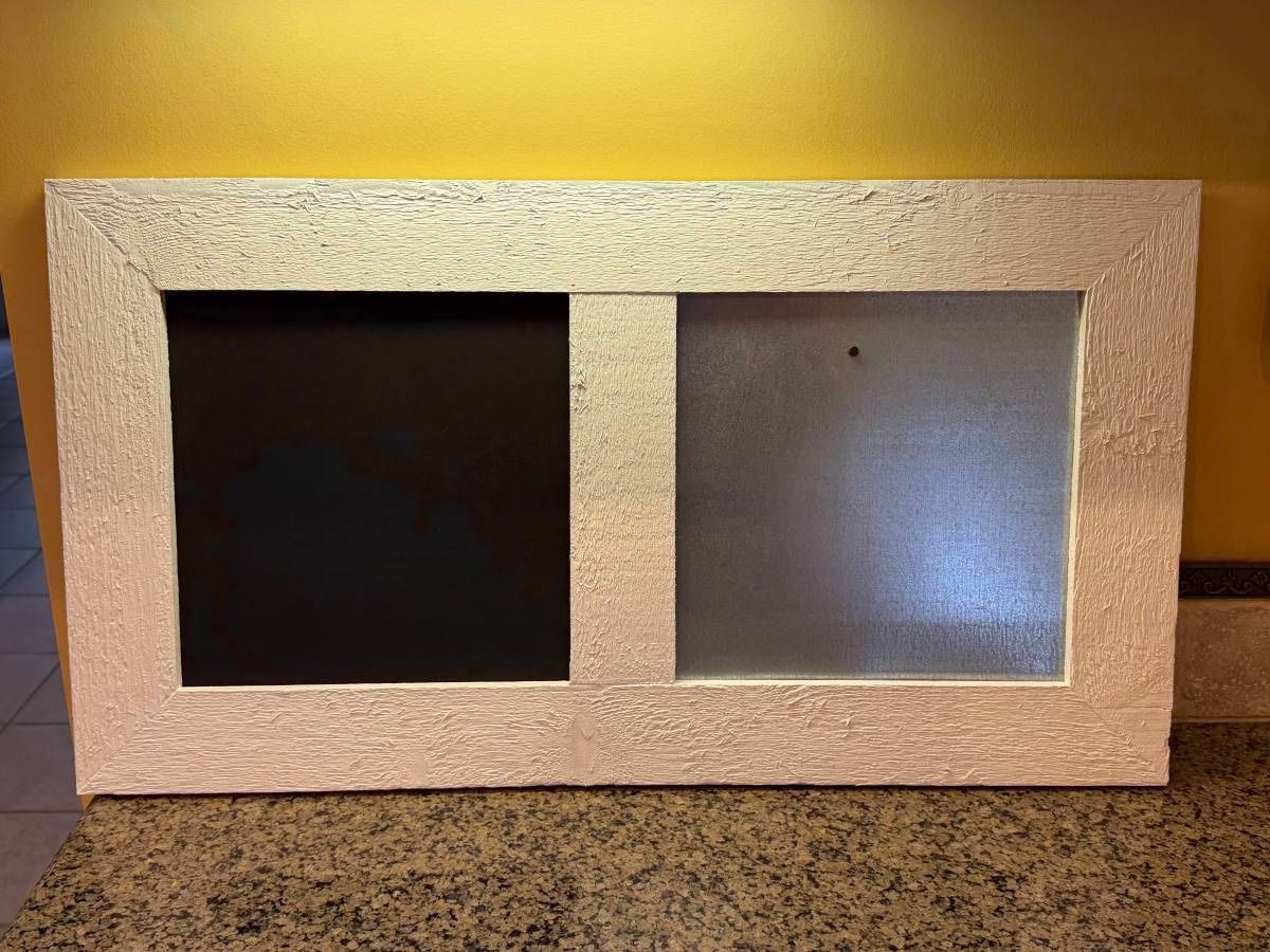 Rustic chalkboard and magnetic board constructed out of rough-sawn cedar. Dimensions are 17"H x 31"W.