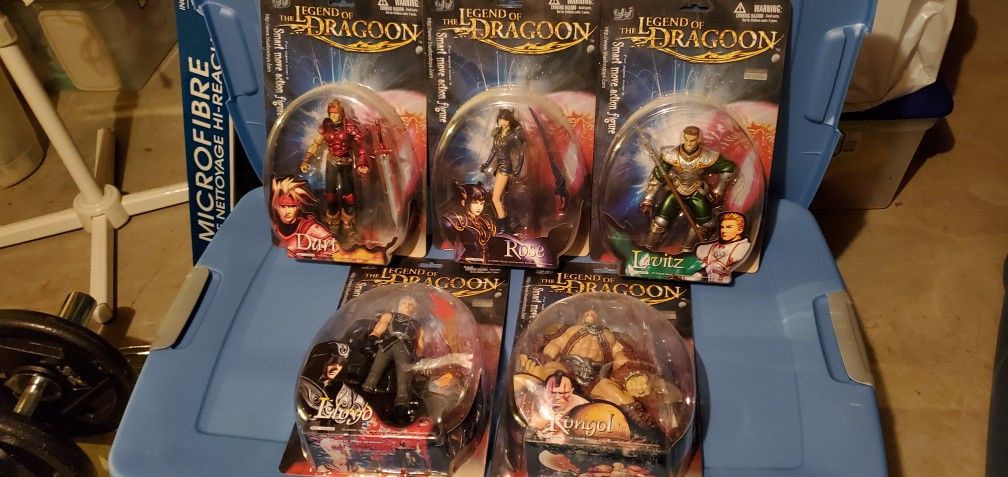 The Legend Of Dragoon figures, still sealed and complete, stored in a smoke free home. It's almost a complete set, as the Shana figure is not included. I am open to trades as well, mainly being pc components Dart Rose Lavitz Kongol Lloyd