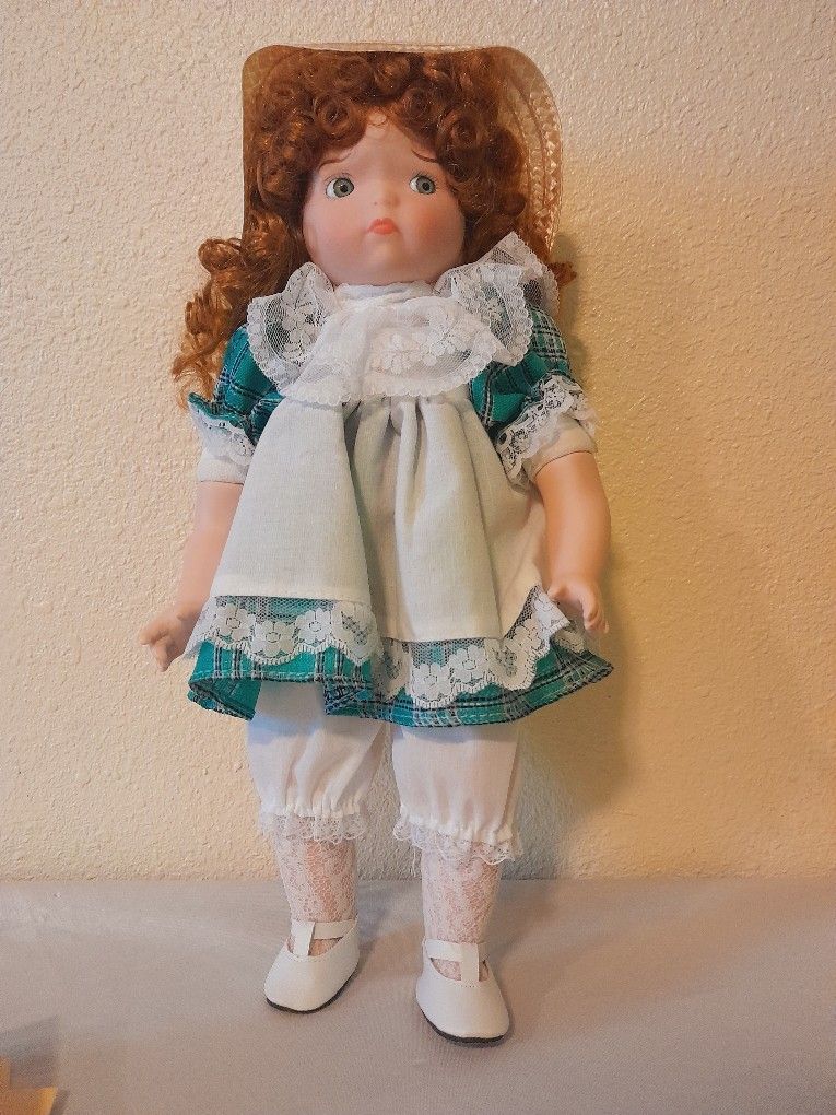 Beautiful new porcelain/ cotton doll by Heritage Mint Ltd Collection (Green Mint). Doll's body is filled with grade A cotton stuffing. Head, arms and legs are crafted with Bisque porcelain. Facial- eyelids, lips and cheeks are individually hand-painted. Original box included Approx. Measurements: 14" height