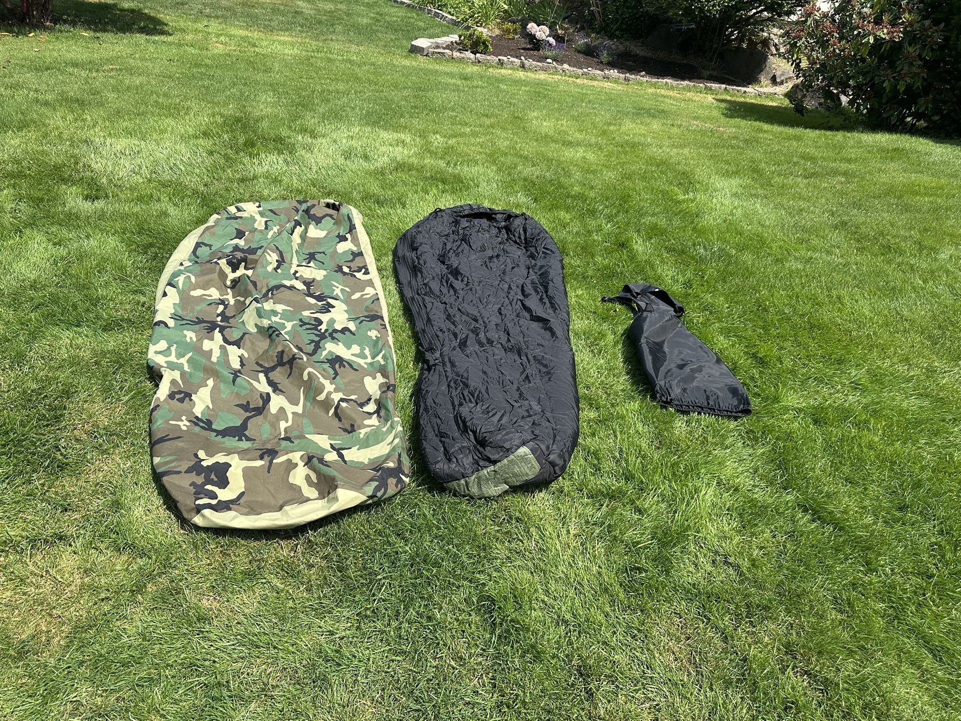 Extreme cold weather military sleep system. Military grade sleeping bag and bivy cover. Set includes (1) intermediate sleeping bag. Rated for temperatures 30* to minus 10*. Zippers in excellent working order. No rips or tears. (1) waterproof woodland Gortex bivy cover. Zippers in excellent working order. No rips or tears. (1) stuff sack in excellent condition Porch pickup in Lakewood . Price is firm. No online payments .