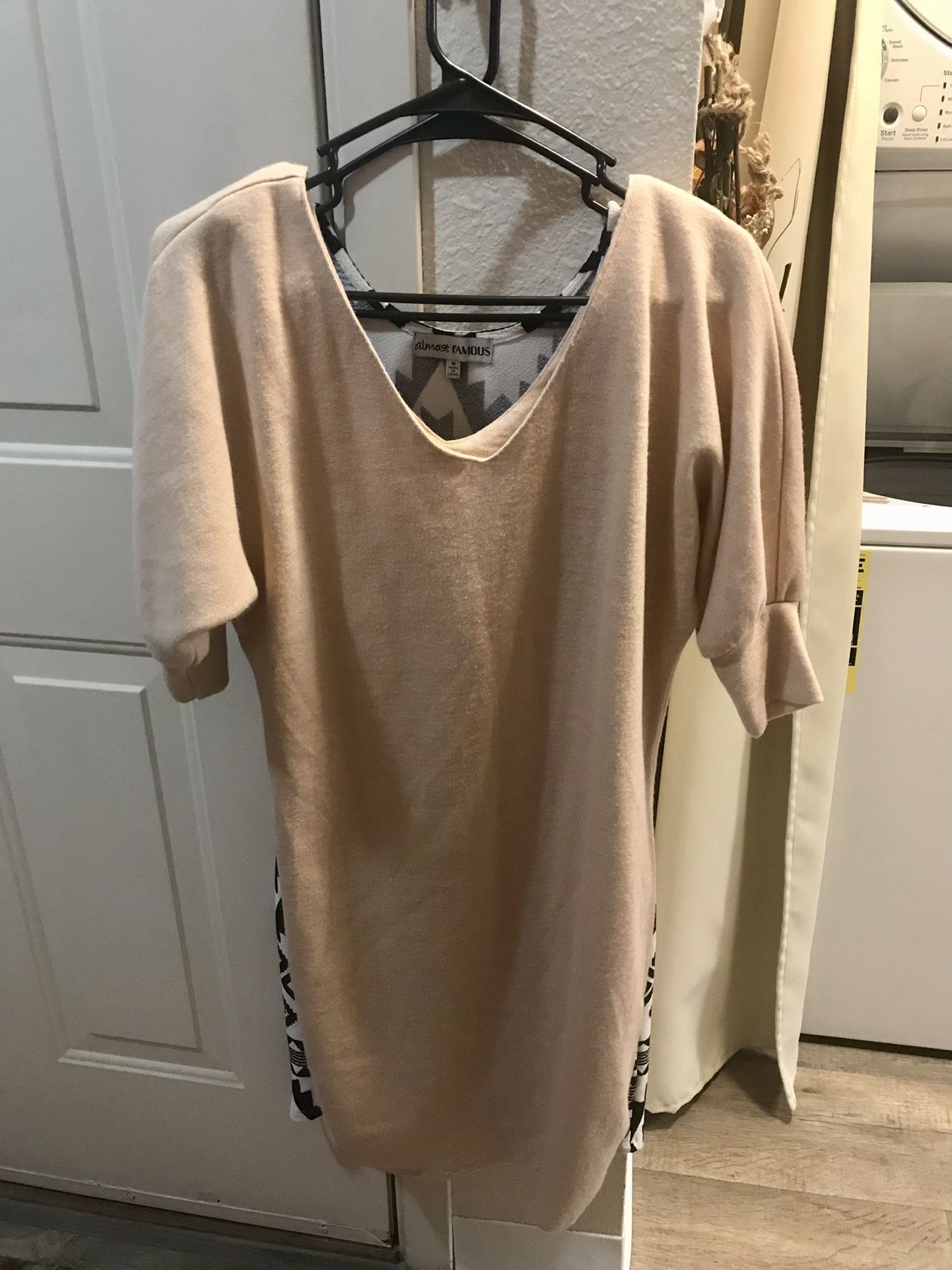 One Almost Famous brand Size Medium fits snug (or size small well) black and white south western. Classy work horse dress for all places. One custom size medium, loose, and very classy winter work (or dinner) dress. Feels like cashmere and cotton. Soft creamy brown.