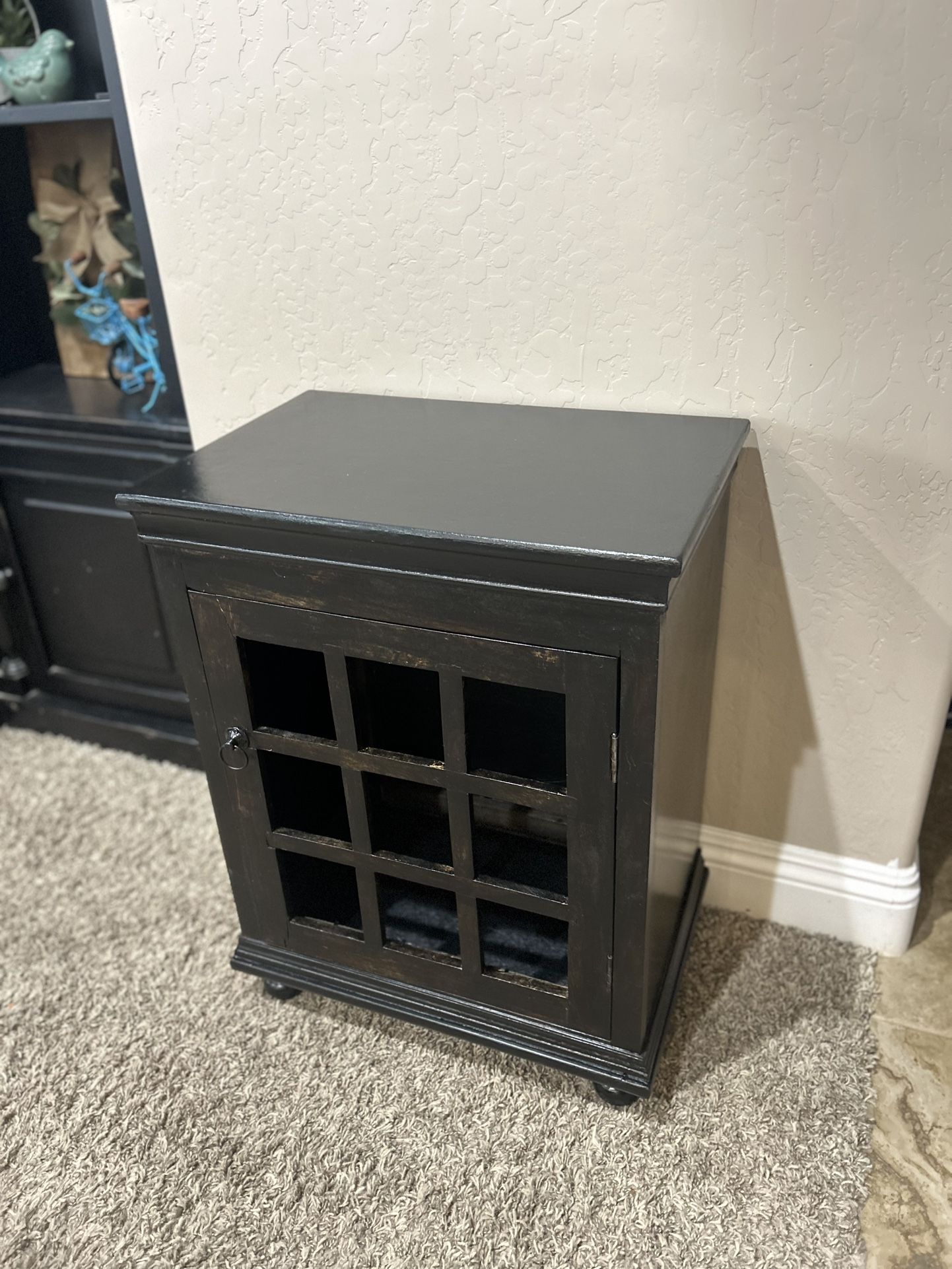 Unique hand-finished wood side table or small cabinet featuring a stained wood front and sleek black painted sides. The open grid-style door gives it a farmhouse, rustic charm—perfect as an accent table, nightstand, or stylish storage piece. This is a solid wood, one-of-a-kind item that was carefully refinished using high-quality materials. The result is a sturdy, attractive piece that blends modern and vintage aesthetics. Dimensions: Height: 27 in Width: 20 3/4 in Depth: 13 3/4 in