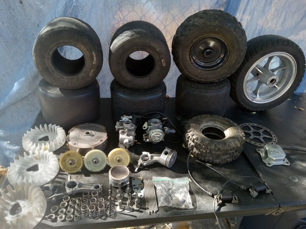 Minibike gokart parts for sale take all as a bundle deal $125 or individual prices 11x7.10-5 tires $15 each 2 fir $25 4 for $40 10 inch rim has bald tire and the sprocket threads are damaged but works perfect for a front wheel $45 Front 6 inch rim with a 135/70-6 knobby tire $40 212 stock rod $10 212 stock piston$5 212 stock flywheel with fan $10 Coleman 196cc piston and rod $20 or $10 each Stock springs and valves $5 224 cam $20 196cc cams $10 each Stock pushrods $5 a set 212 stock coil pack $10 Coleman coil pack $5 Disc brake $5 Electric carbs for gopeds and scooters $5 each Ohv cover $5 Take all as a bundle deal for $125 trying to clear up space