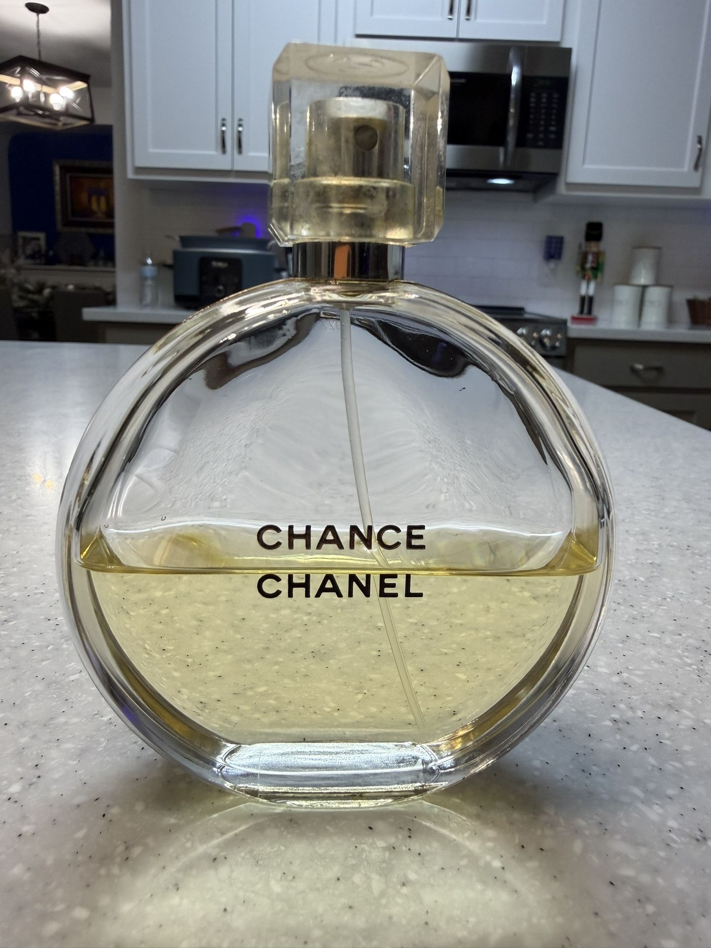 Authentic Genuine GABRIELLE CHANEL Chance Womens Parfum Spray 3.4 Oz. Bottle is about 50% full. Retails for $200 after tax. This item was kept in a smoke and pet free environment. Meet at Petco 4610 Williams Dr Georgetown 78633 Fragrance Family: Floral Scent Type: Warm Florals Key Notes: Jasmine, Pink Pepper, Vanilla Fragrance Description: Unpredictable, in perpetual movement, the unexpected floral fragrance sweeps you into its whirlwind of happiness and fantasy. COMPOSITION: CHANCE is a fragrance created like a constellation, a composition like an olfactory sphere that opens up in an infinite movement. At the heart of this sphere is a sensuous balance warmed by Vanilla, with pronounced Jasmine Absolute and Iris. A mysterious alchemy, heightened by the intensity of White Musk.