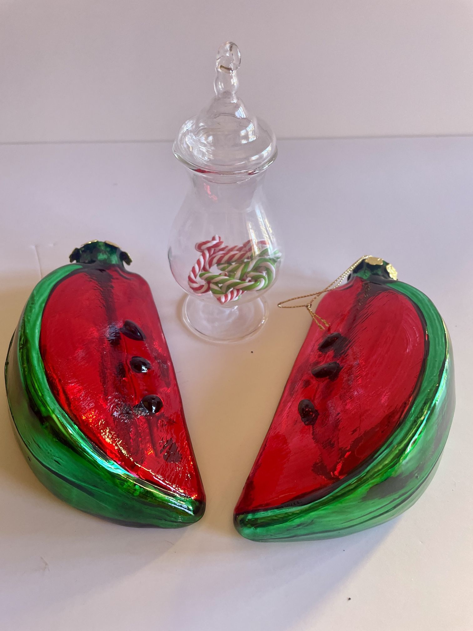 2 glass watermelon slice ornaments. They are 6.5” long and 3” wide. 1 glass apothecary jar with small candy canes inside. The jar does not open. Looped top for hanging. 6” tall and a 2” base. $5 each Redlands, CA Cross posted I don’t ship