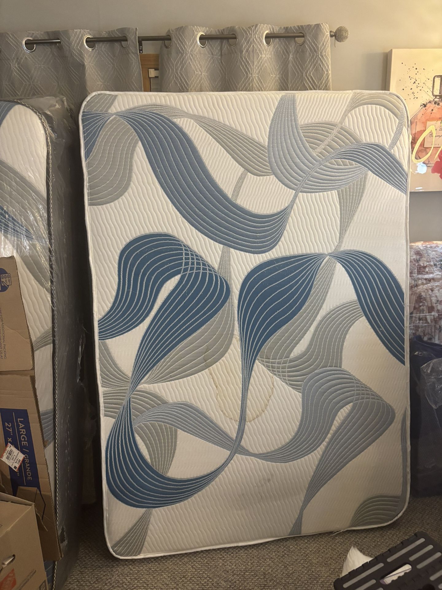 Full-size mattress has one soda stain can be cleaned before pick up. My niece might’ve used it for less than three months. It is really basically new . It is just the mattress. When I moved, I had nowhere to fit the boxspring.
