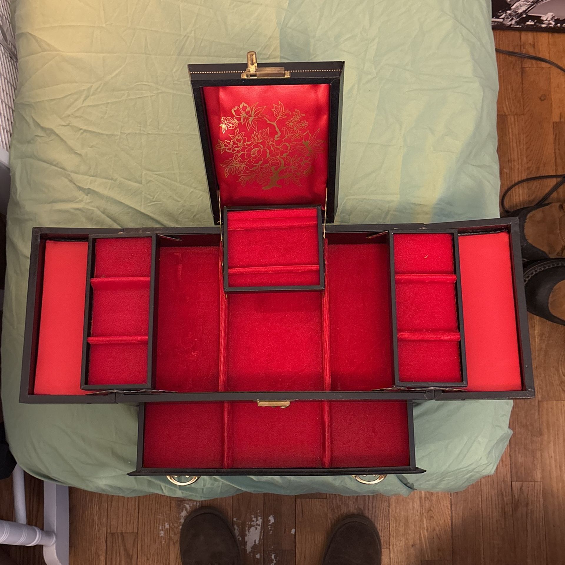 Vintage lightly used collectible Jewelry https://offerup.com/redirect/?o=Ym94LkJsYWNr leather exterior and red velvet interior.Asian gold flower tree pattern inside.Great https://offerup.com/redirect/?o=Y29uZGl0aW9uLm5v key to box.locks and unlocks still just no key.