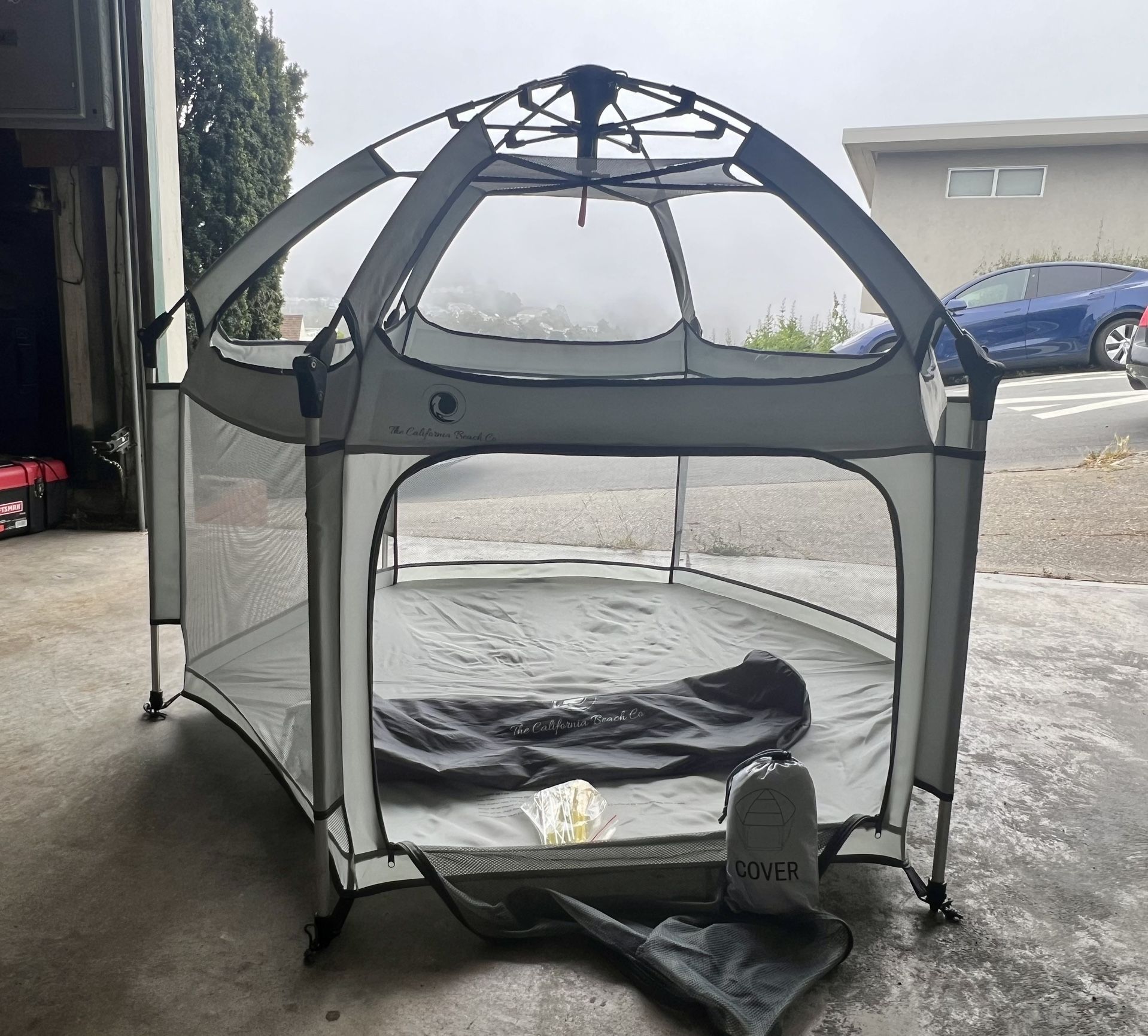 Gray tent with sun cover Includes stakes for dirt and sand+ carry bag. (No mat) This is a Dec 2020 purchase direct from vendor. Used for less than a year, mostly indoors instead of traditional pack n play Been stored for 3 years in garage.
