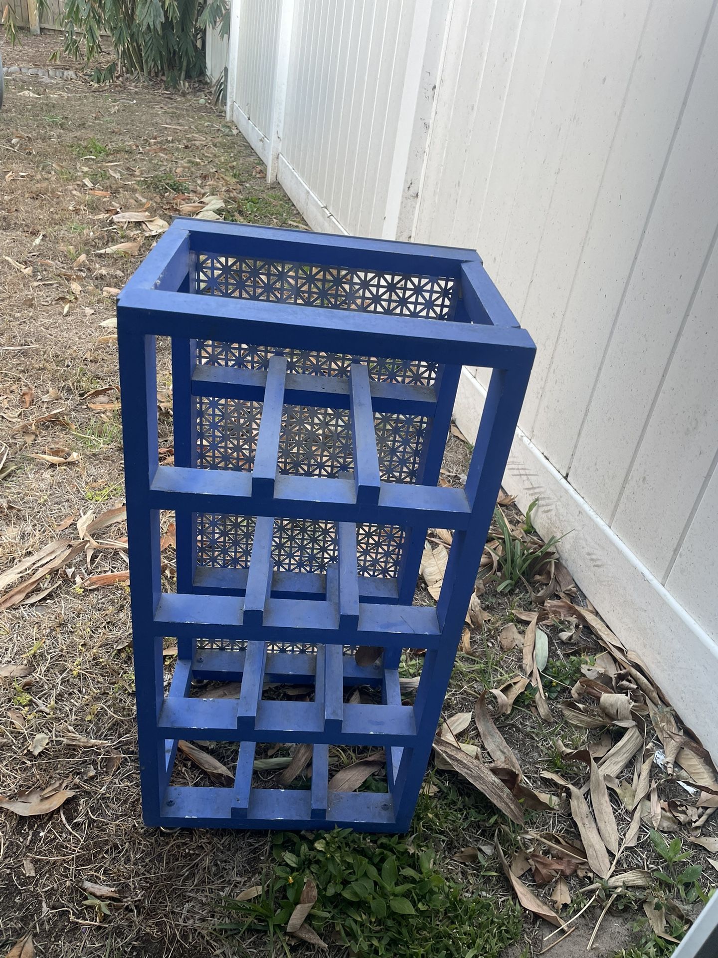 Wine rack perfect for any house. Holds 12 bottles, the larger ones fit perfectly as well. Has feet and stands alone, $25