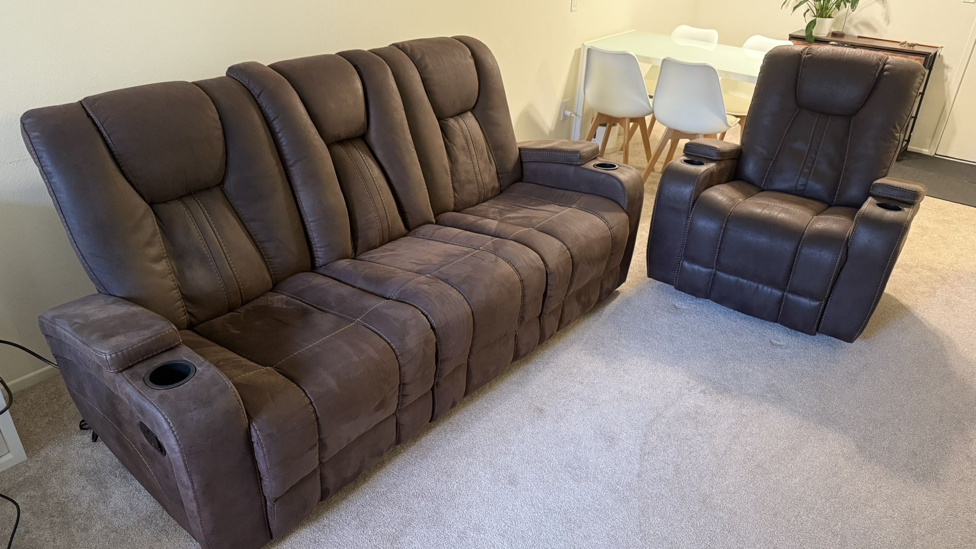 Comfortable reclining sofa for sale. ⚠️ Please note: The reclining chair shown in the photos has already been sold. Only the sofa is available. The sofa is in great condition — clean, well maintained, with no tears or major stains. It’s not electric, it’s manual (mechanical). Price: • Reclining sofa: $400 Features: • Reclining sofa • Manual recline • Built-in USB ports & power outlets • Center console with cup holders & storage • Touch control panel in the middle seat • Cup holders on armrests • Very comfortable, perfect for movies or relaxing