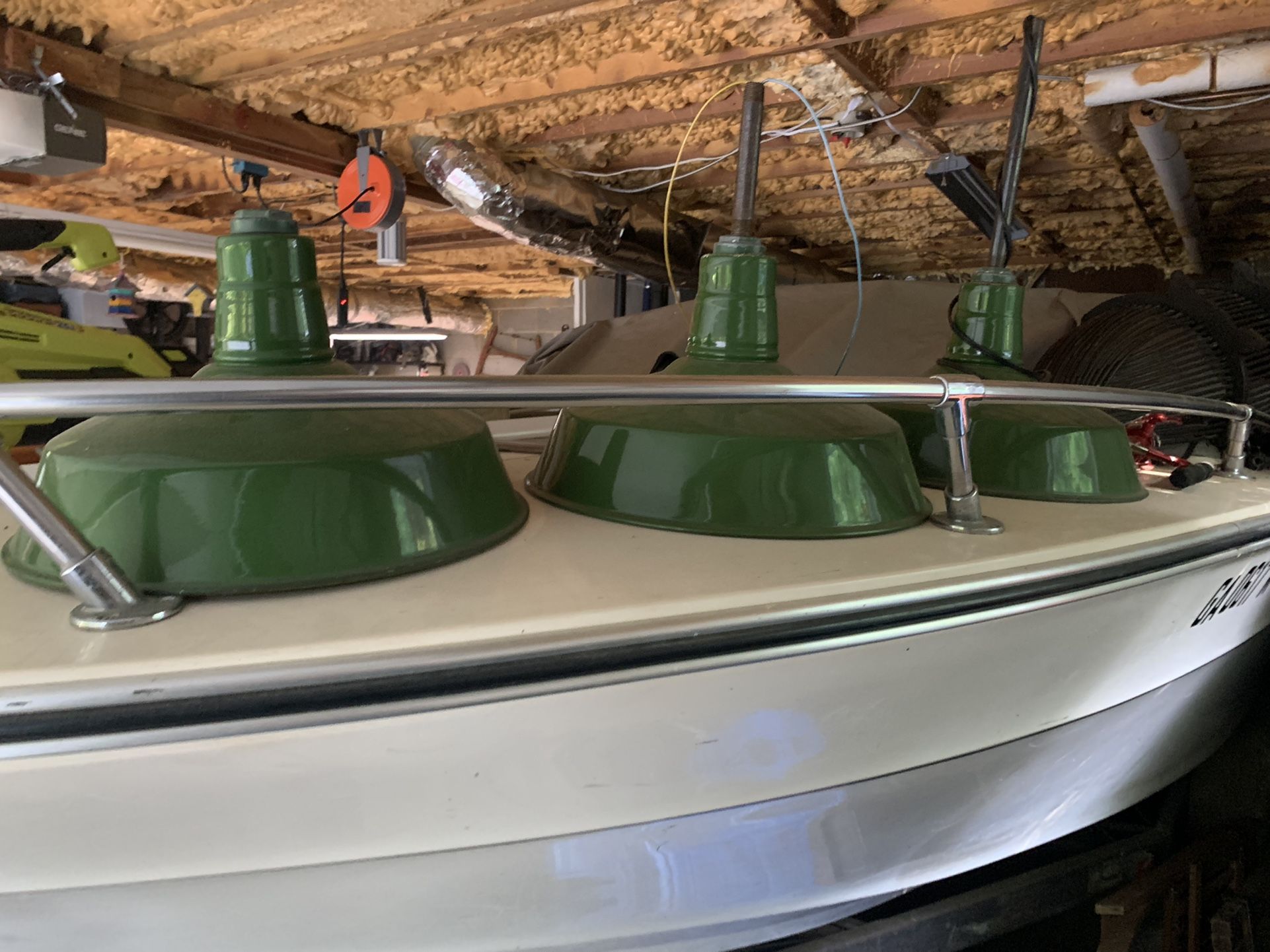 3 Barn Lights 16” x 16” by whatever length Ceiling to Lamp mounting, poles. 10” - 4’ with poles or your own chain. Original ceiling mounts come with these lights. All Benjamin and all 98.9% Flawless. No scratches, no pitting, no chips. White porcelain enamel on inside. Selling all 3 as set with all hardware for 2100. Or 700.00 each. Hardware/ceiling mounts circa 1930 brand new in box