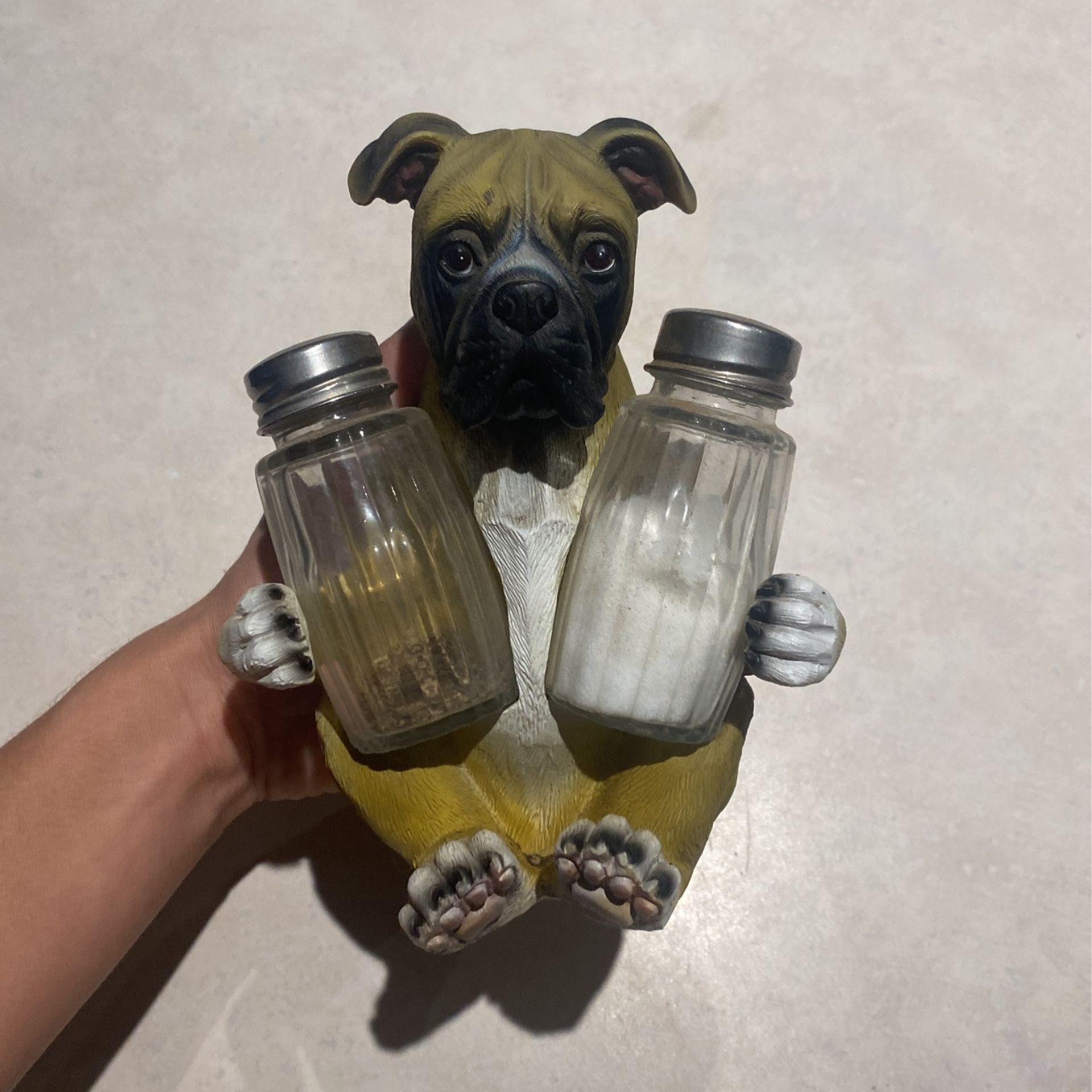 Adorable salt and pepper shaker. Boxer dog holding both shakes, they come off to refill. It comes with containers.