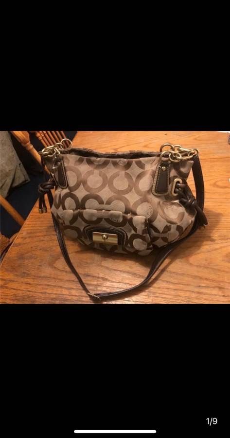High desert newer Adelanto pick up- Coach Brown Signature logo print medium- large size purse. Dark brown leather trim adjustable longer strap & shorter handles to wear of style, $45. Brass Gold chain link metal accents all over. Thick Brown leather tubed twist tied knots strap & gold tips designs both sides. Few slip pockets on 1 side & large zipper on other. Good condition but has few scuffs on outer top rim brown logo at top zipper rim & bottom seam corners this price is based of its size. Barely able to see in pictures so please zoom-in on details. Pretty coral pinkish inside satin feel lining is very clean no stains or big rips.