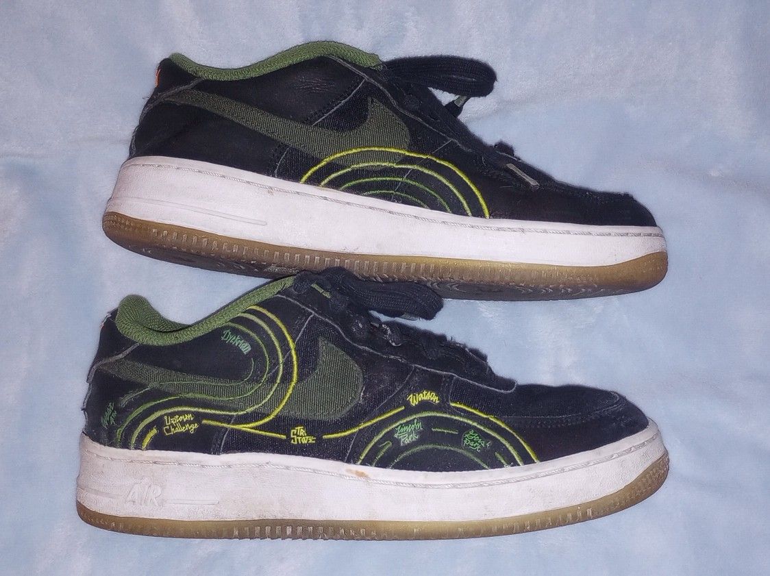 Nike Air Force Ones Black & Green Y 6. Good condition. They are clean & ready to go. A faded spot on top of right shoe. Please see pics & ask any questions.