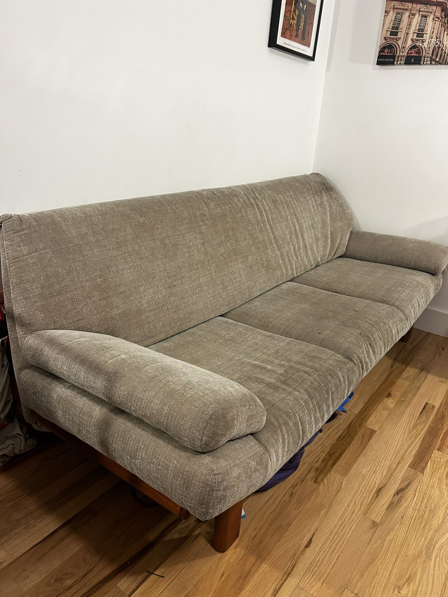 This is a mid-century modern futon that I was gifted. All of the cushions are completely removable and washable as seen in the photos. It just no longer fits my space and I would like something smaller. The wood finish at the bottom of the couch is completely intact and gorgeous. I always kept a couch cover on it so All it needs is someone who’s willing to wash its cushion covers. HEAVY And would need 2 people at least to move it out. Hope it goes to a great home! ✨ $100 OBO