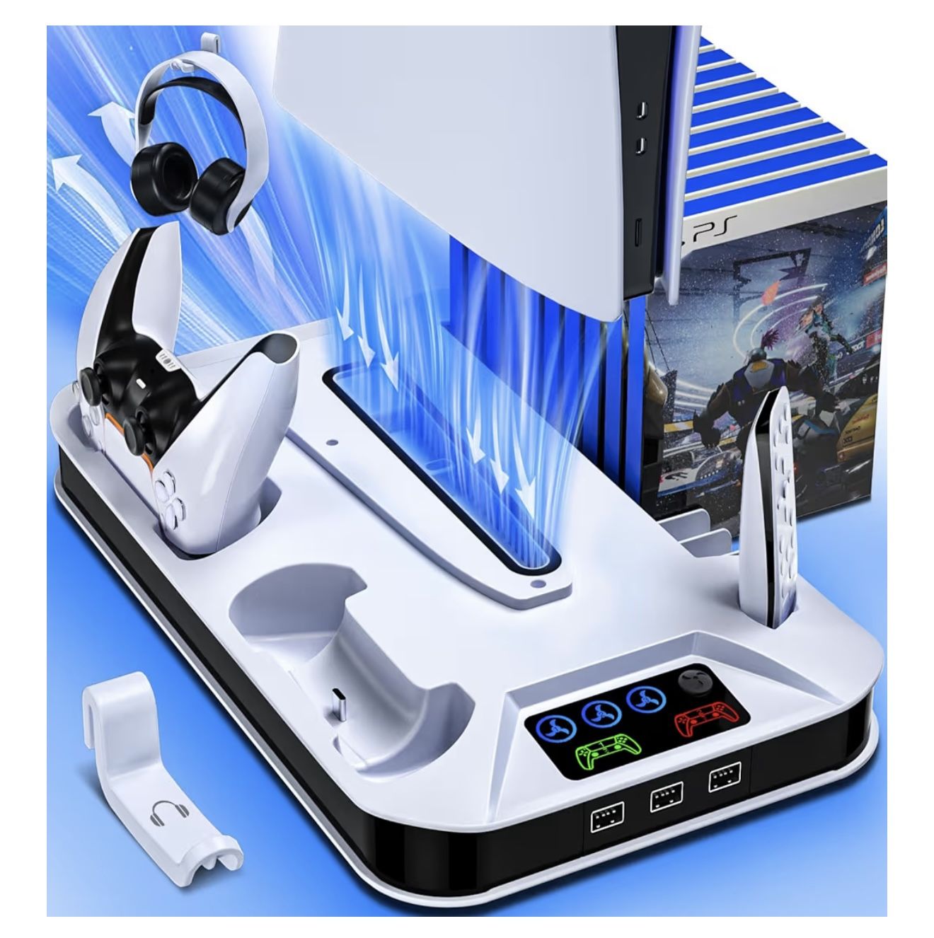 New in box Amazon $40 PS5 Cooling Stand with 3 Speeds Turbo Cooling Fan: The ps5 stand with cooling fan and controller charger has a hight-efficent turbo fan to greatly cool down your ps5 console for Sony PSP by dissipating the hot air from the bottom of console for Sony PSP even during long gameplay sessions, helping it stay away from overheating and extending its service life. The cooling fan in this ps5 slim vertical stand can be adjusted to High, Mid, Low 3 speeds to meet your different need Fast Charging PS5 Controller Charger in 3H: Powered by ps5 console for Sony PSP or 5V/3A adapters, the ps5 charging station with cooling fan takes only 3 hours to fully charge both ps5 controllers simultaneously. No worry about the dead controller influencing your game sessions.The LED indicators on the ps5 cooling base clearly show the fan speeds and the charging status of ps5 controller accessories: RED-Charging; GREEN-Fully Charged/standby Fit All Series PS5 Console Pro & Slim & Standard Disc/Digital Version: The ps5 stand with cooling station perfectly fits for both 2020 ps5 standard and 2023 new ps5 slim digital&disc console for Sony PSP. The ps5 cooler base comes with a safety screw to lock the console for Sony PSP and stand to make it more secure and balanced. The ps5 slim cooling stand perfectly matches the aesthetic design of PS5 console for Sony PSP. (Please remove the panel adapter on the cooler station if your console for Sony PSP is a ps5 slim digital&disc version) Extra 3 USB Hubs & Overcharge Protection: The ps5 pro cooling base with controller charging dock has extra 3 USB charging ports to charge ps5 controllers, ps5 headset, ps5 HD camera and other devices. Adopted smart protective chip, the ps5 pro cooling charging station will stop charging by a battery volume of 80% to protect ps5 controllers from overcharging, overheating, overcurrent, overvoltage and short circuits, ensuring controllers' safety and longevity even charged overnight Multifunctional PS5 Base Stand & Safe Space: The ps5 cooler station can well organize ps5 controller accessories, wireless headset, media remote control, screw and 13 ps5 games disc in one place, save space and keep your gaming area neat and tidy while keep the PS5 setup cool and get a nicer look, making it easy to access to your ps5 accessories when you need it. The ps5 pro cooling fan station is a better replacement for official PS5 charging station and horizontal base stand A Must-Have PS5 Cooling Fan Stand: It's a must-have cooling station and charging station for ps5 console for Sony PSPand ps5 controller(Not for edge controller)! The ps5 slim cooler station has 2 charging docks for ps5 controllers, a media remote slot, a headset holder, 3 USB ports and a cooling fan. Package List: PS5 Cooling Stand 1; Headset Holder 1; PS5 Panel(attached on the stand) 1; Screw1. Please feel free to contact us if there is any problem with products from our Kammkonb Note: The ps5 controller, ps5 console, ps5 headset, ps5 media remote, ps5 game dics are not included