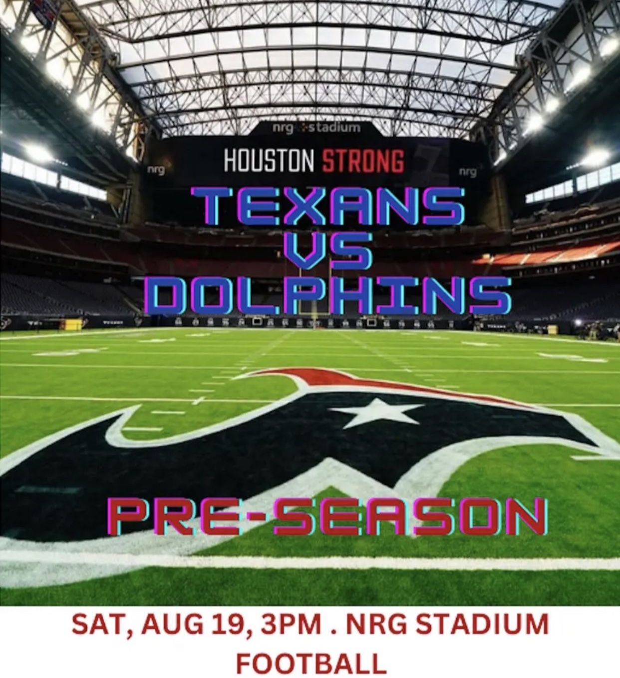 I have 2 tickets available for the Texans game August 19th @3:00 pm Section 105 Row CC Seats 12,13
