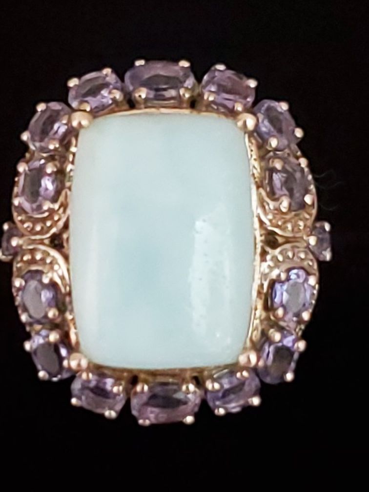 antonese Blue Aragonite (Cush 9.35 Ct), Iolite Ring in Platinum Overlay Sterling Silver (Size 6) TGW 11.46 cts. Exquisite Old World Setting in a modern design. Look up the healing properties of the stone.