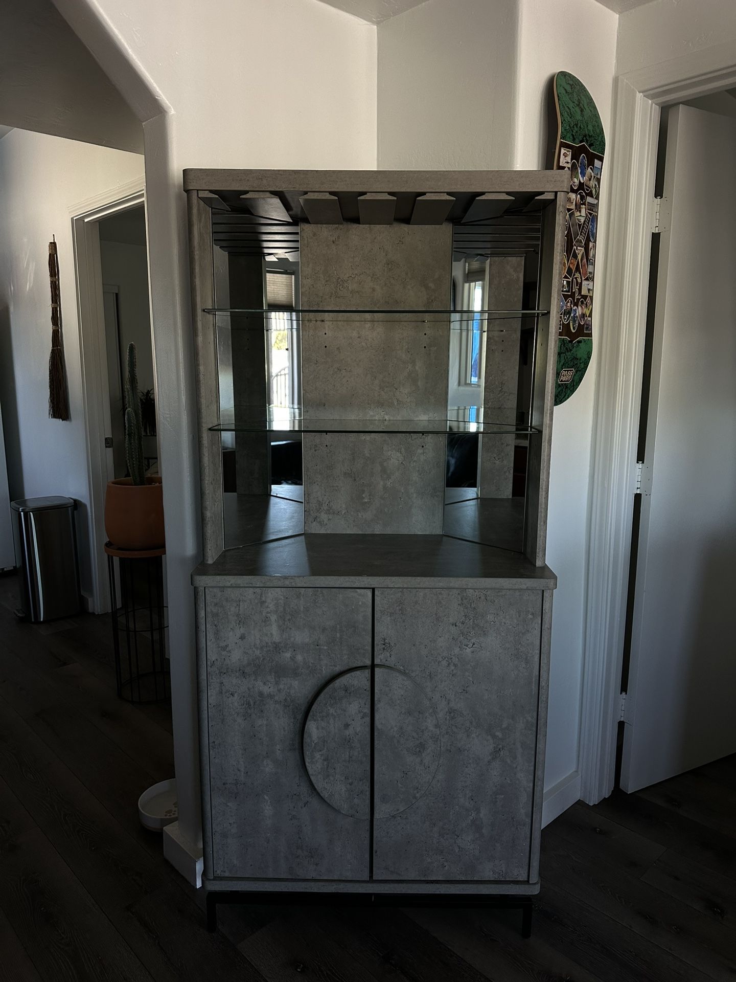 Beautiful glass bar with cabinet and shelves, can easily be taken apart for easy transportation Has normal wear no big dings scratches or dents