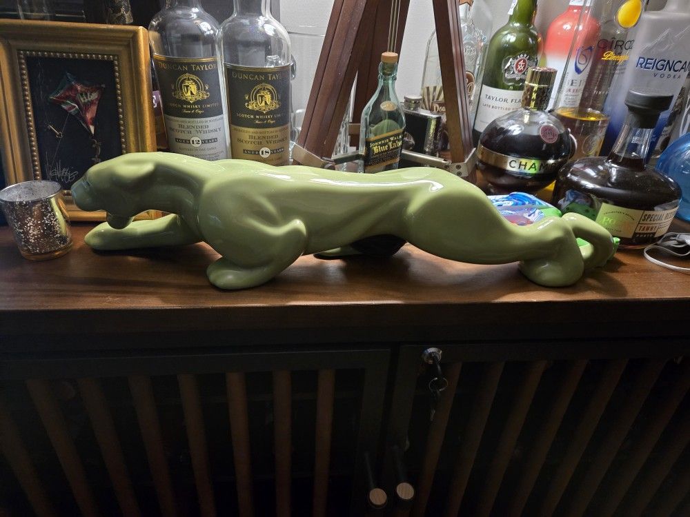 This striking green figure is a vintage Mid-Century Modern "Stalking Panther" TV lamp, a popular decorative item from the 1950s