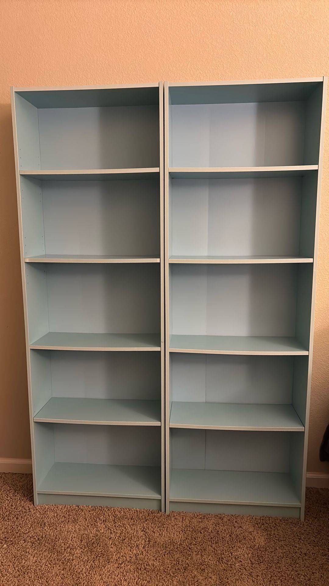 Light Blue 2 Book Cases Good for the children’s room (Pastel vibes) Each- $20 Both - $30 W: 23.5 inches, D: 9. 5inches, H: 70 inches