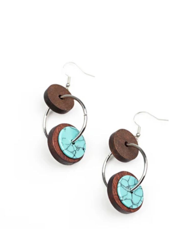 An earthy collection of brown wood and turquoise stone discs are threaded along a silver hoop, linking into a trendy lure for an artisan inspired fashion. Earring attaches to a standard fishhook fitting. $5 plus $4.50 shipping