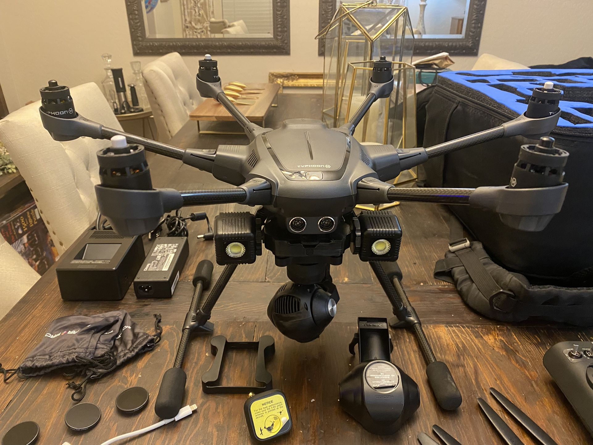 Yuneec Typhhon Hexacopter with 2 memory cards, memory card reader, 3 camera lens filters, 2 spotlights, 2 batteries, wizard remote, and soft shell foam carrying backpack.