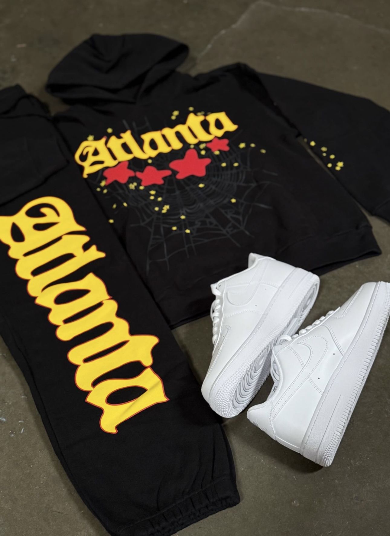 Sp5der Atlanta Hoodie and matching sweatpants set in black with yellow