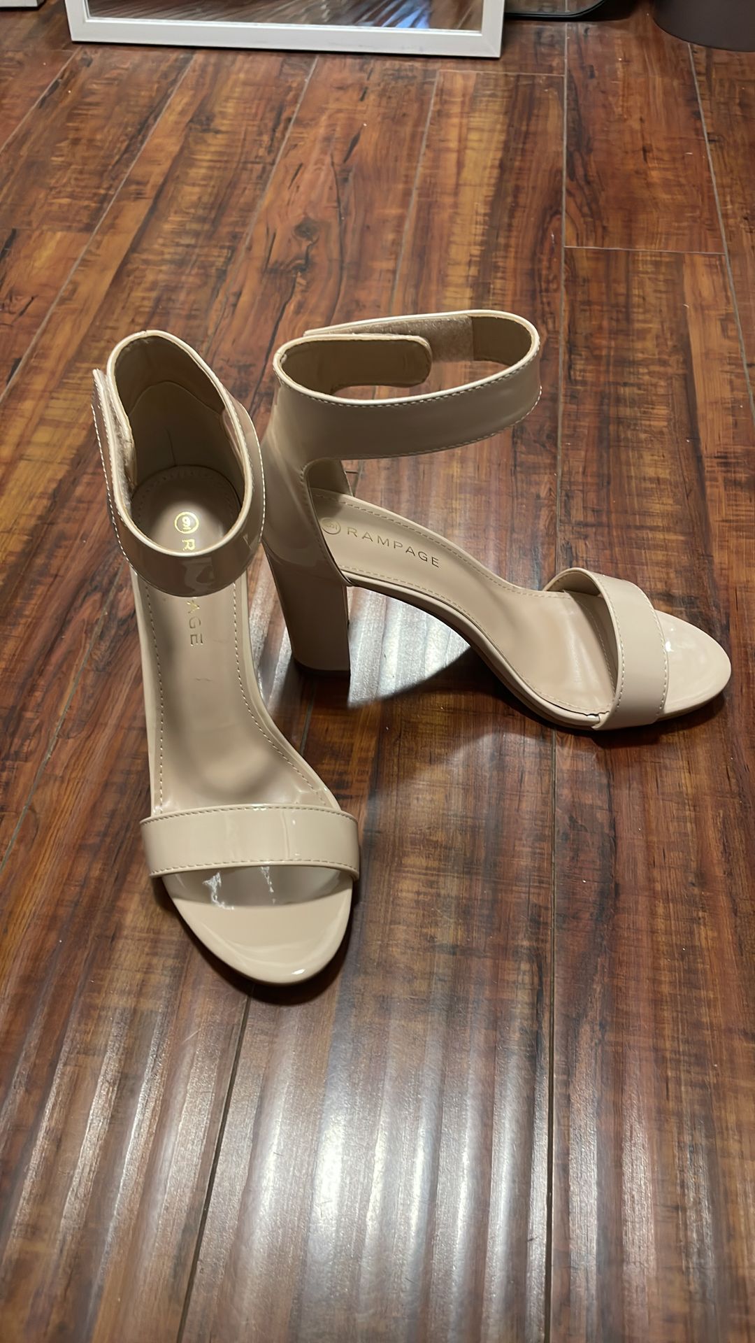 Rampage size 9 beige, faux patent leather, block heel sandals about 3 inches, Velcro closure, never worn. New, no tags or box. Purchased at Ross for $18.