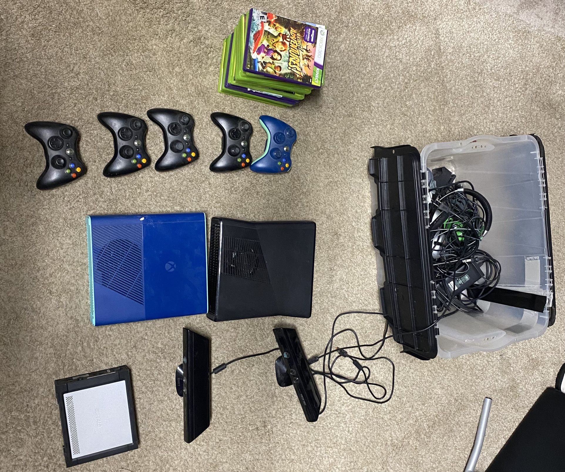 I have 2 Xbox 360s in pretty good condition. It comes with 5 controllers, 17 different games, and 2 xbox 360 Kinects. All the cords are in the box with some headphones. Price is negotiable