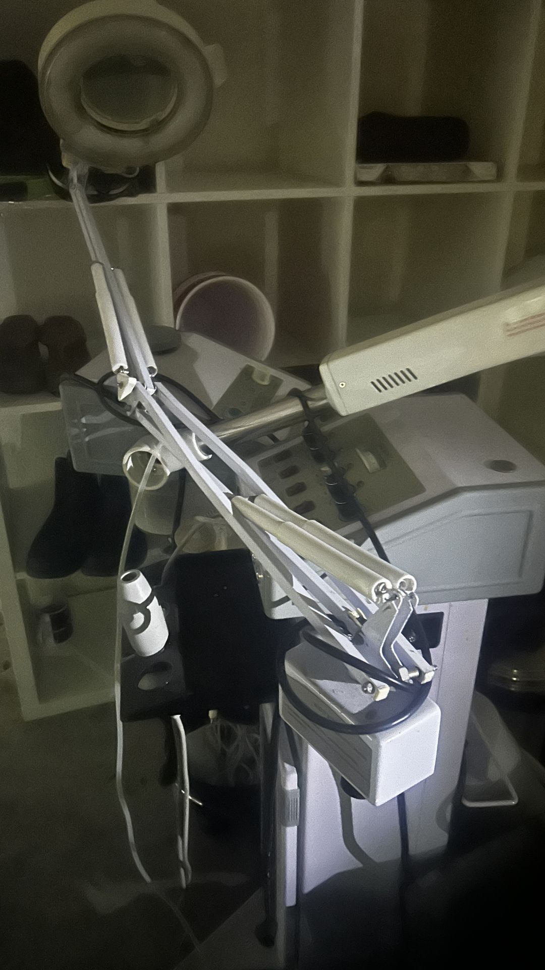 • Lámpara lupa con luz (ideal para limpiezas faciales, extracciones y análisis de piel). • Brazo articulado ajustable. • Vaporizador facial (la parte metálica con tubo donde sale el vapor). • Base con soporte y controles. • Estructura móvil de cabina. Este tipo de equipo se usa para: • Limpiezas profundas • Hidratación con vapor • Ablandar comedones antes de extracción • Evaluación detallada de la piel (con la lupa)