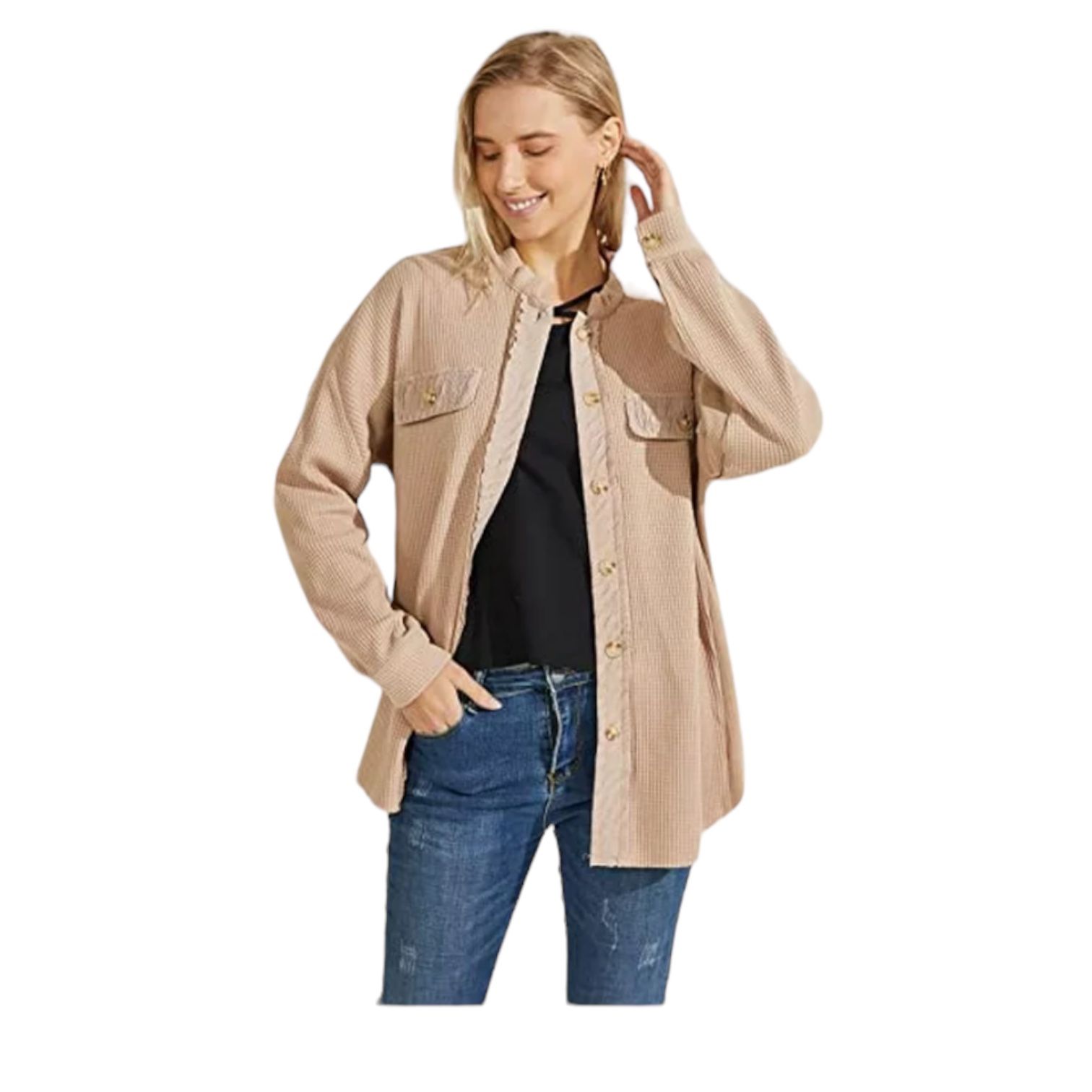 Women's Sz S Vintage Banded Collar Button Down Baggy Loose Fit Mid-Weight Frayed Waffle Knit Shacket Shirt Tops Condition: New Color: