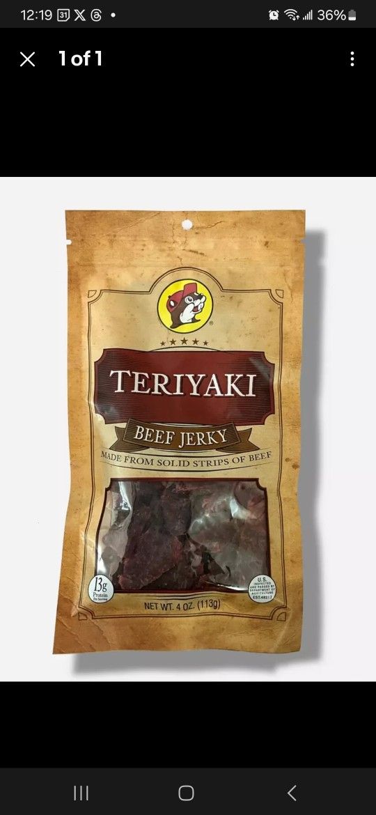 Indulge in the delicious taste of BUC-EE'S Teriyaki Beef Jerky, a perfect snack for any time of the day. This 4oz pack of beef jerky is low in sugar and carbohydrates, making it a healthy option for those looking for a quick and tasty bite. The jerky is made with high-quality ingredients and has a unique teriyaki flavor that will surely satisfy your taste buds. With a serving size of 1oz and four servings per pack, this beef jerky is perfect for sharing with friends and family. It has an expiration date of 08/06/25 and is made in an American regional cuisine style. The product is a deli and preserved meat and poultry type, and it weighs 4oz. This item is a great addition to your pantry and is perfect for any occasion. Teriyaki Beef Jerky is a savory delight made from hearty beef strips, infused with a distinct teriyaki flavor. Crafted in Texas and evoking the taste of home, this jerky offers a delicious countryside experience on your travels. (4 oz per package) We purchase this genuine, new product at retail value. Prices from us will be higher than if purchased directly from a Buc-ee's store.