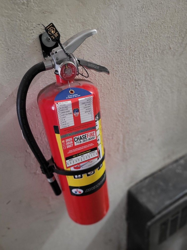 This is a Badger ABC dry chemical fire extinguisher. It's rated for multiple types of fires. The last serviced date is visible on the label. 4 left